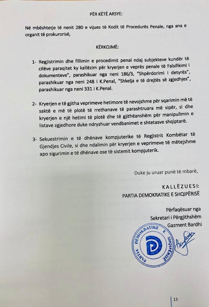 Në padinë e firmosur nga Sekretari i Përgjithshëm i PD, Gazment Bardhi, Prokurorisë së Posaçme Antikorrupsion i kërkohet të sekuestrojë të dhënat kompjuterike, siç është Rregjistri Kombëtar i Gjendjes Civile për të vërtetuar ndërhyrjet e paligjshme në sistem me qëllim ndryshimin e adresës ëë vendbanimit dhe, për rrjedhojë, të pengojë qyyetarët të votojnë, përmes ndryshimit të vendvotimit.