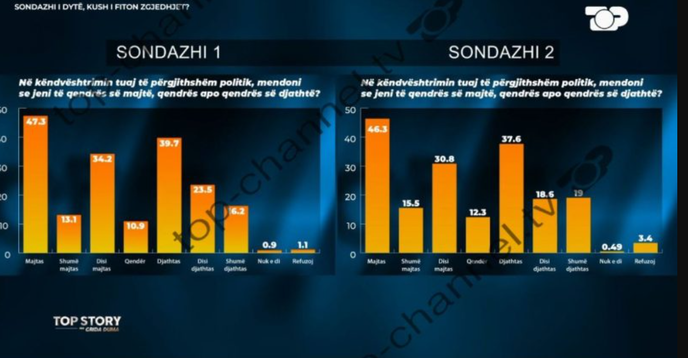 Sonte në ”Top Story” është publikuar sondazhi i dytë i realizuar nga kompania e njohur amerikane ”McLaughlin and Asociated” me Top Channel. Pyetur se si do të votojnë shqiptarët, ja si janë përgjigjur! Edhe në këtë sondazh të dytë, majtas kanë pohuar 46.3%. Në krahasim me sondazhin e bërë në shkurt, ideologjia e majtë, shumë majtas, djathtas, disi djathtas dhe shumë djathtas kanë pësuar rënie, ndërsa rritje kanë pasur disi majtas dhe qendra.
