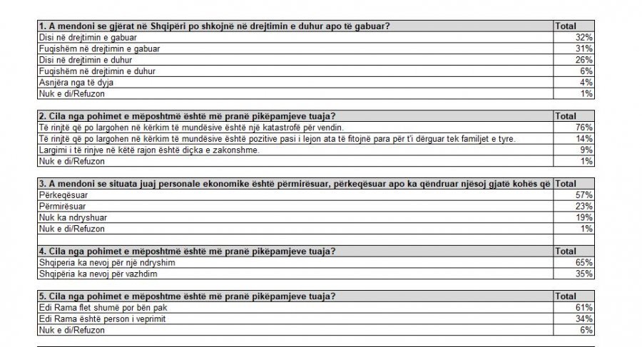 Në pjesën e parë sondazhi është ndalur te situate ekonomike dhe nëse vendi po shkon në drejtimin e duhur apo të gabuar. Më poshtë tabela dhe përgjigjet e sondazhit.