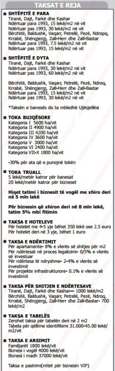 Këshilli Bashkiak i Tiranës mblidhet më 30 dhjetor për të miratuar taksat dhe tarifat e reja për banorët e kryeqytetit. Në total janë 11 taksa e tarifa, që nga shtëpitë e banimit e deri te pronat që ata posedojnë. Ndërkohë një taksë e re që pritet të miratohet është ajo për infrastrukturën arsimore, e cila nuk është gjë tjetër veçse ishtaksa e gjelbërimit, vlera e së cilës mbetet e pandryshueshme, 1800 lekë në vit. Kjo taksë do përdoret për rikonstruksionin e objekteve arsimore. Përjashtim nga pagesa e saj bëjnë pensionistët, veteranët, invalidët e luftës, përfituesit e ndihmës ekonomike, të verbrit dhe të sëmurët tetra e paraplegjikë. Më poshtë tabela me taksat e reja.
