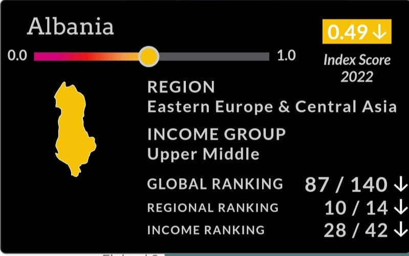 Raportet e organizatave ndërkombëtare prestigjioze, konfirmojnë vit pas viti, se zbatimi i ligjit në Shqipëri po përkeqësohet në mënyrë të ndjeshme. “Indeksi i Sundimit të Ligjit 2022”, përgatitur nga World Justice Project, është tregues i gjendjes reale ku ndodhet vendi dhe një “thirrje” e fuqishme për të reaguar kundër korrupsionit në rritje, për të kërkuar më shumë rend, siguri, drejtësi efektive dhe të paanshme për të gjithë. Konkluzionet e WJP konfirmojnë se Shqipëria ka nivelin e hajdutërisë së Qeverisë më të lartë në kontinent. Nga matja e 4 parimeve universale të Sundimit të Ligjit, llogaridhënies, ligjit të drejtë, qeverisjes së hapur, drejtësisë së paanshme dhe të aksesueshme, rezulton se Shqipëria ka pësuar rënie duke u renditur në vendin e 87 mes 140 vendeve, tre pozicione më poshtë nga viti i kaluar kur ndodhej në të 84-tin. Ndërkohë që Kosova vit pas vit shënon progres, duke u renditur në vendin e 57 nga vendi i 60 që ndodhej në vitin 2021.
