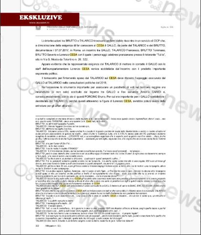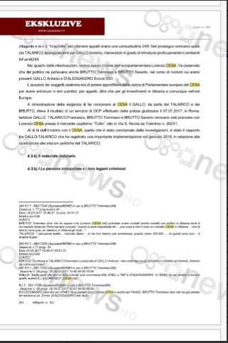 Europarlamentari Lorenzo Cesa ka dalë në skenë në përgjimet e antimafias italiane si personi që koordinon ndërhyrjet e nevojshme në Tiranë me qëllim garantimin e tenderave, koncecioneve dhe lejeve të ndërtimit për grupet kriminale të goditura nga operacioni i fundit në Itali. Protagonist i bisedave të zhvilluara është edhe sipërmarrësi Antonio Gallo i cili në pjesën e parë të përgjimeve të publikuara nga Ora News, flet për dhënien e rryshfetit në masën 20 për qind për lejet e ndërtimit në Tiranë.