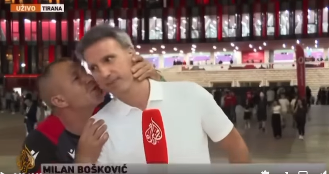 Tifozi shqiptar puth në faqe gazetarin serb gjatë raportimit live pas përfundimit të ndeshjes.