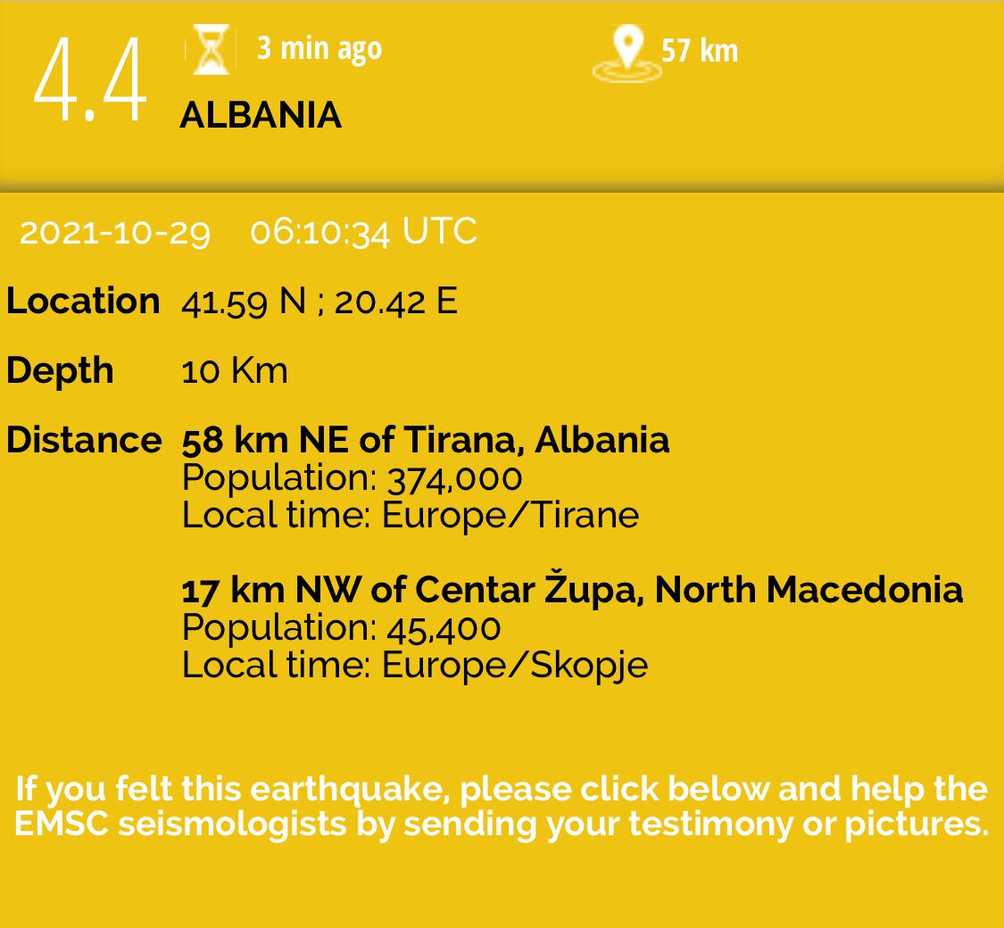 Magnituta e këtij tërmeti ka qenë më e fortë se e para, pasi bëhet fjalë për magnitutë 4.4 të shkallës rihter, ndërsa thellësia 10 km.