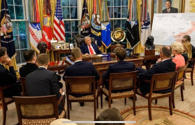 Eshtë bërë virale kjo foto kur Presidenti Trump priti në Shtëpinë e Bardhë liderët kryesorë te BE dhe presidentin Zelenski. Trumpi në karriken kryesore dhe përballë si në një sallë leksionesh rrijnë tamam si studentë: Kryeministri britanik, kryeministrja e Italisë, Presidentja e Komisionit te BE, kancelari gjerman, presidenti francez, sekretari i përgjithshëm i NATO dhe presidenti ukrainas.