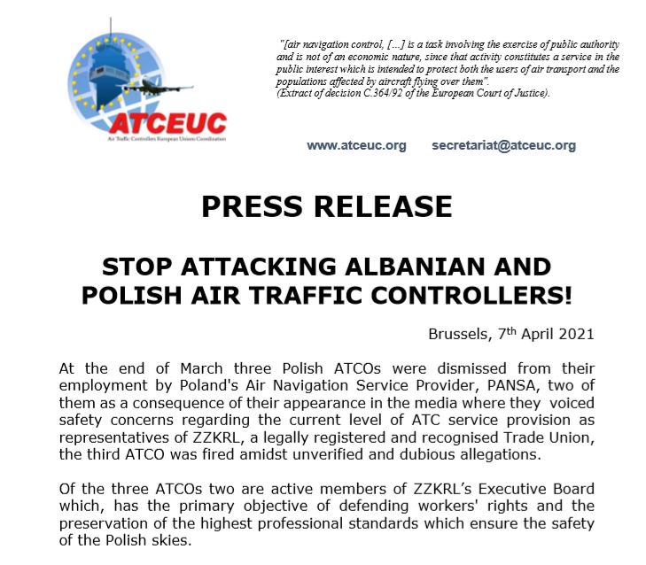 “Ndaloni menjëherë sulmet ndaj kontrollorëve të trafikut ajror në Shqipëri”. Kjo është deklarata e sapodalë në Bruksel nga Unioni për Koordinimin e Kontrollorëve Ajrore Europianë.