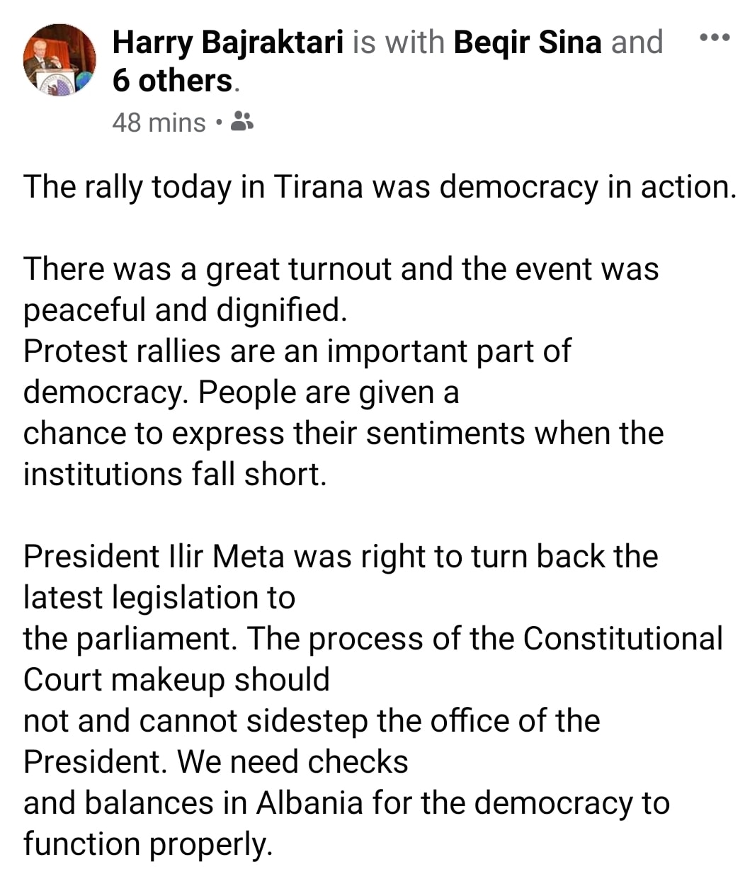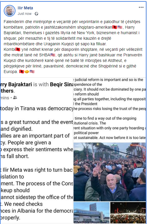 Presidenti i Republikës Ilir Meta ka falënderuar biznesmenin dhe humanistin shqiptar që jeton në SHBA Harry Bajraktari për mbështetjen e tij ndaj manifestimit dhe kauzës së Kreut të Shtetit në mbrojtje të Kushtetutës.