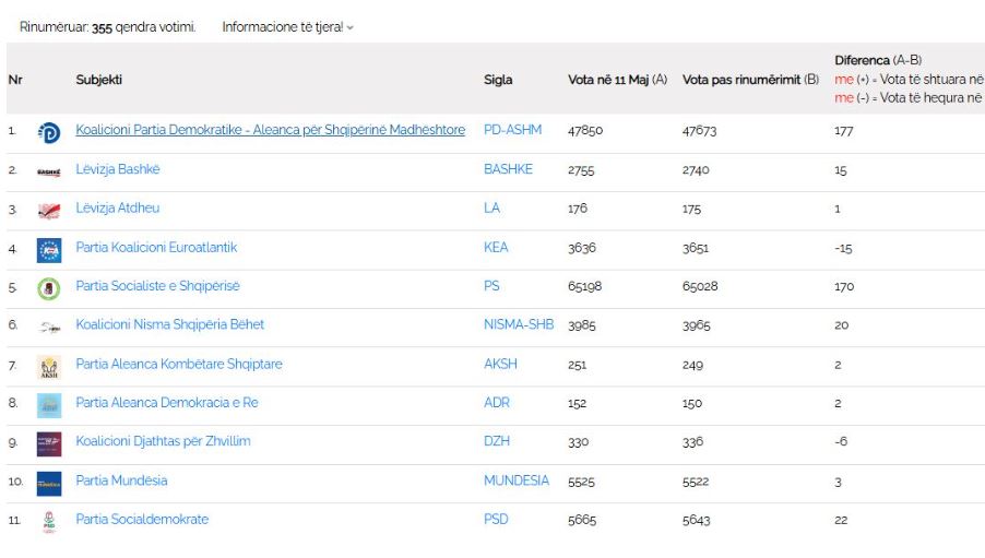Me 355 kutitë e hapura deri më tani, PD kryeson me votat që nuk i takonin. PD rezulton se ka 177 vota të pamerituara, ndërsa PS 170, të cilat iu zbriten nga rezultati i numërimit të parë.