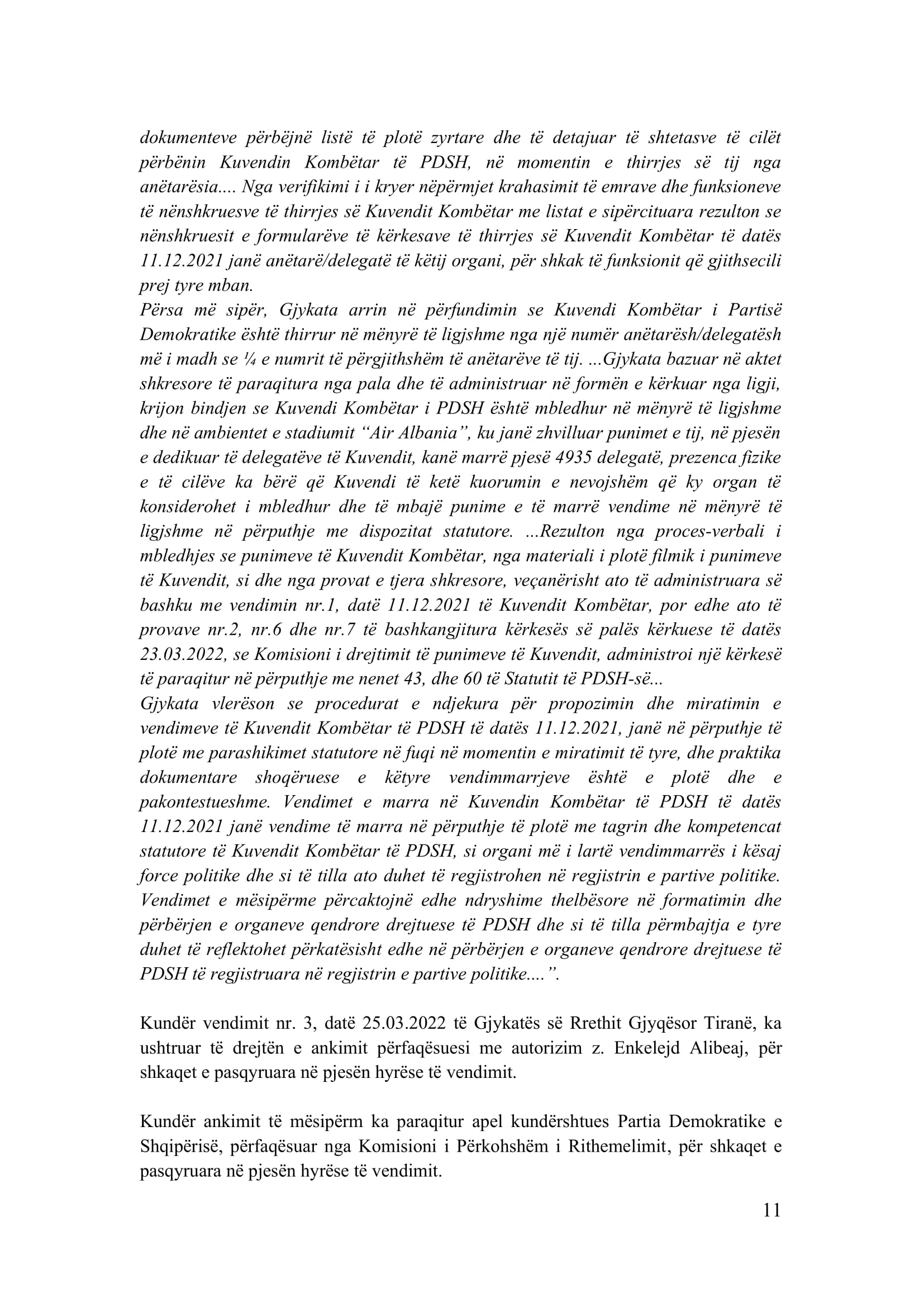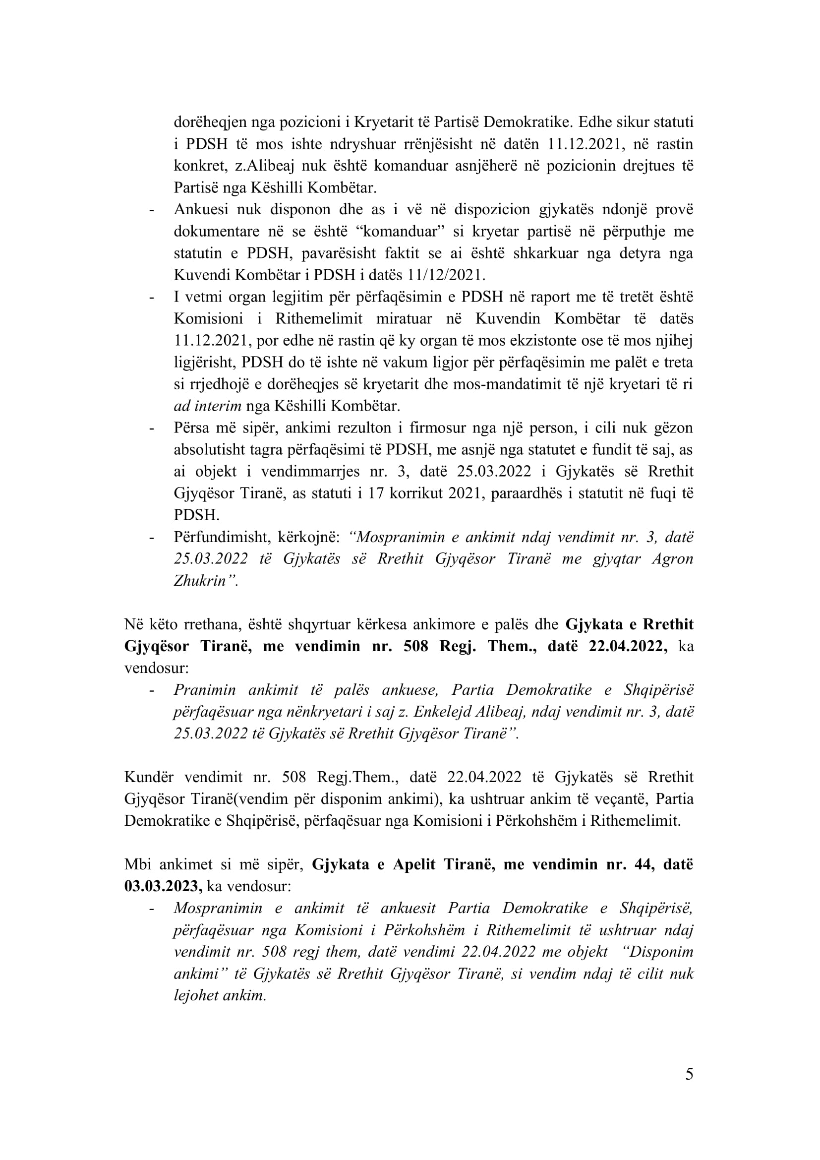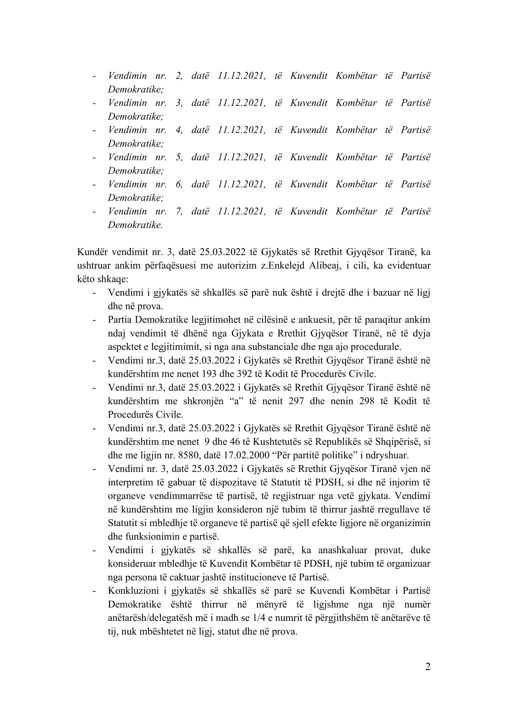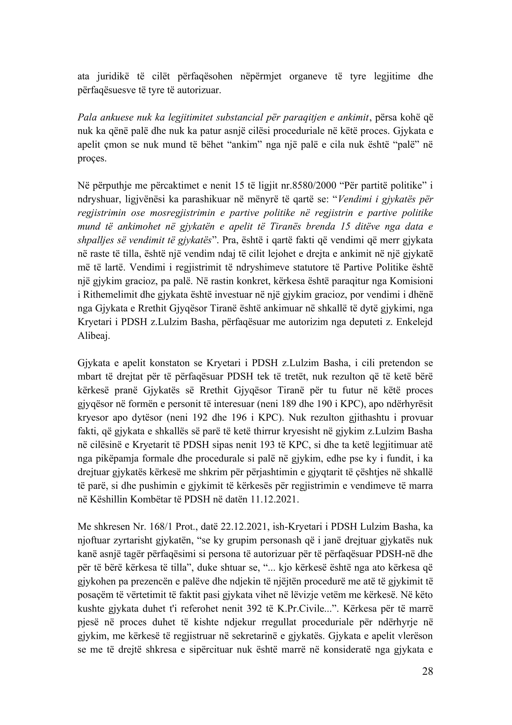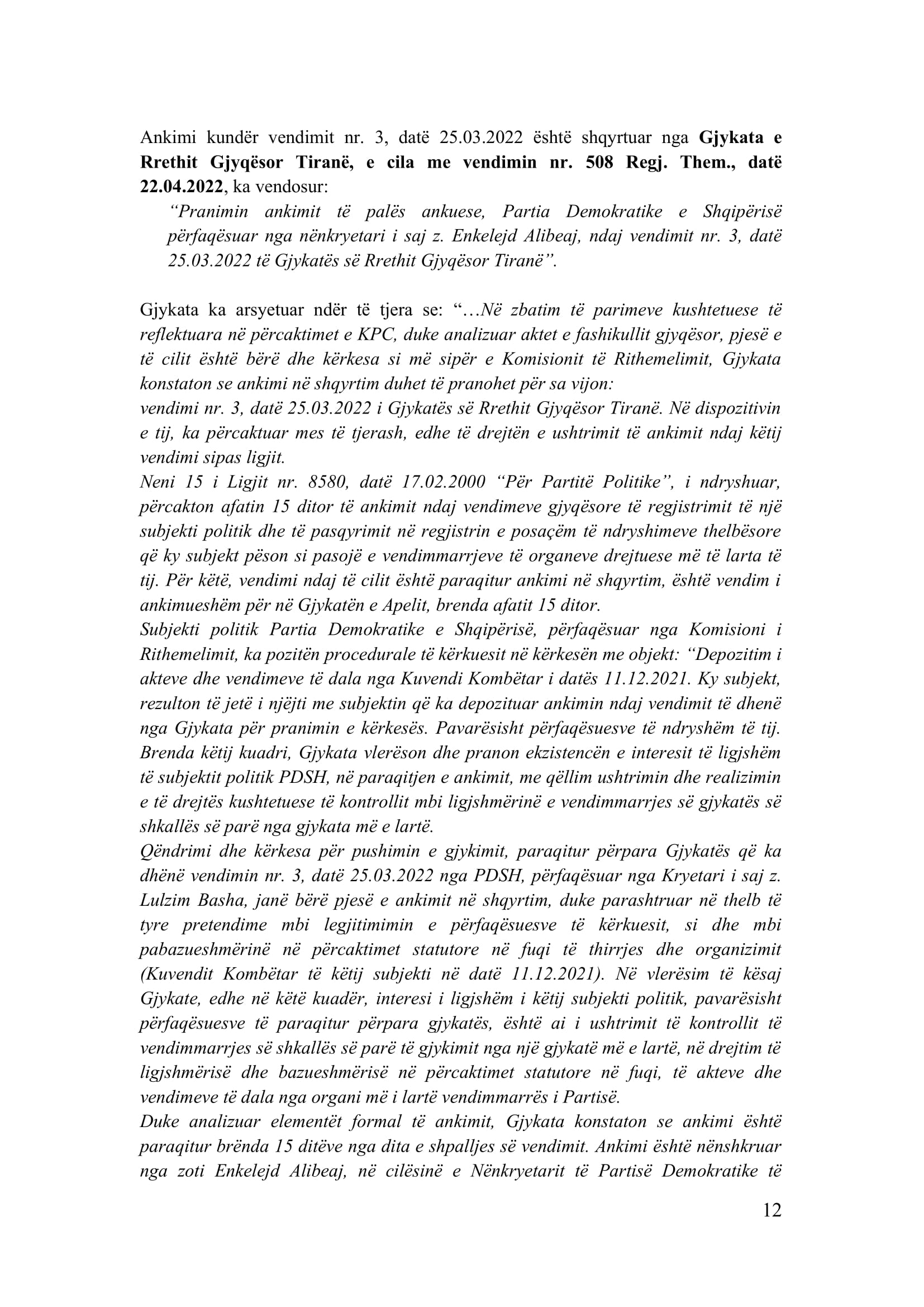 Zbardhet vendimi i Gjykatës së Apelit për vulën e PD-së që ja kaloi Sali Berishës. Apeli i dha të drejtën e vulës, ish-kryeministrit Sali Berisha dhe rrëzoi ankimin e bërë nga Lulzim Basha dhe Enkelejd Alibeaj. Në vendimin e tij Apeli vlerësoi të mos pranojë ankimin e bërë nga Enkelejd Alibeaj, si i autorizuar nga Lulzim Basha, kundër verdiktit të gjyqtarit të Tiranës Agron Zhukri, të 25 marsit 2022. Apeli arsyeton se Lulzim Basha nuk ka bërë një kërkesë në Gjykatën e Tiranës për t’u bërë pjesë në pocesin gjyqësor që ligjëroi Kuvendin Kombëtar të 11 dhjetorit 2021 të thirrur nga Berisha. “Pala ankuese nuk ka legjitimitet substancial për paraqitjen e ankimit, përsa kohë që nuk ka qenë palë dhe nuk ka patur asnjë cilësi proceduriale në këtë proces”, thuhej në vendimin e arsyetuar.