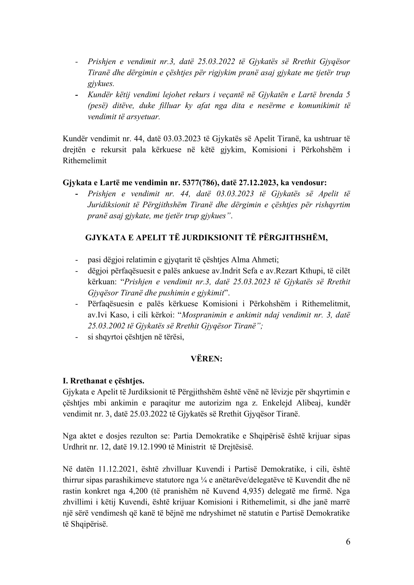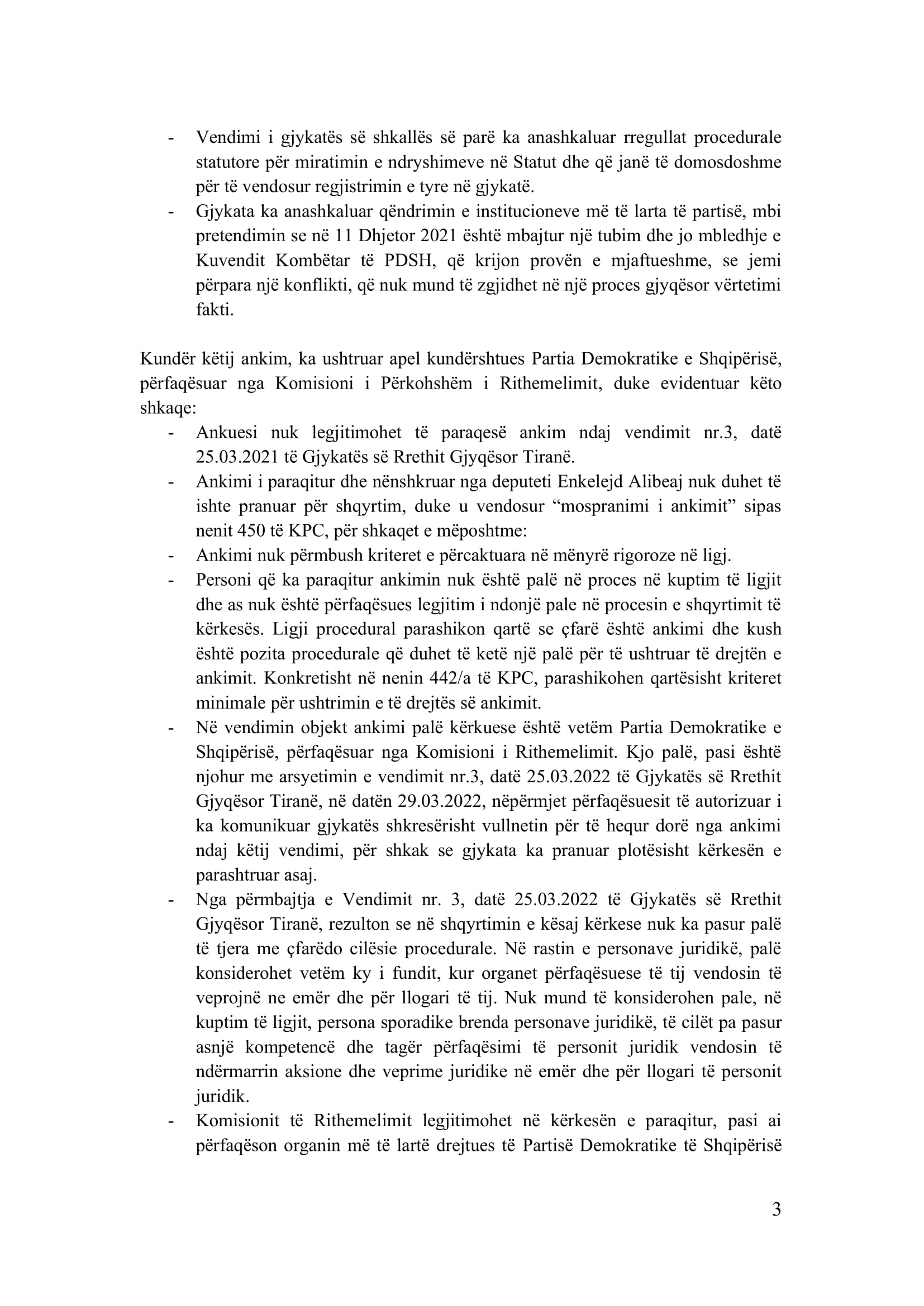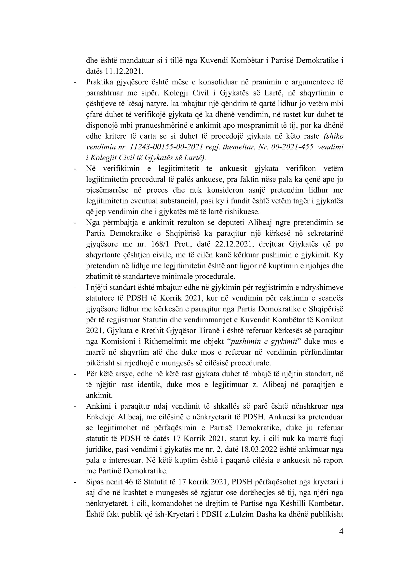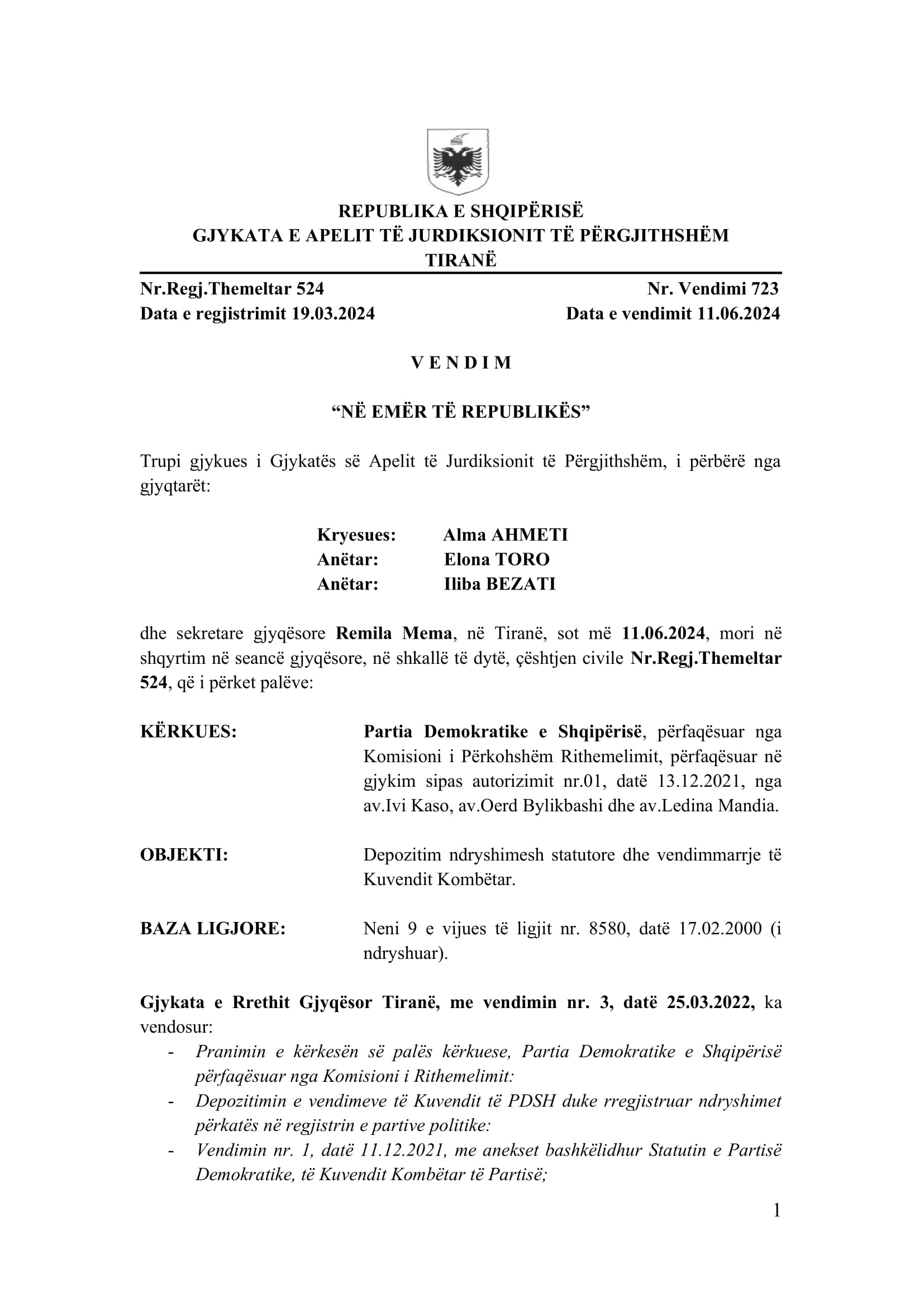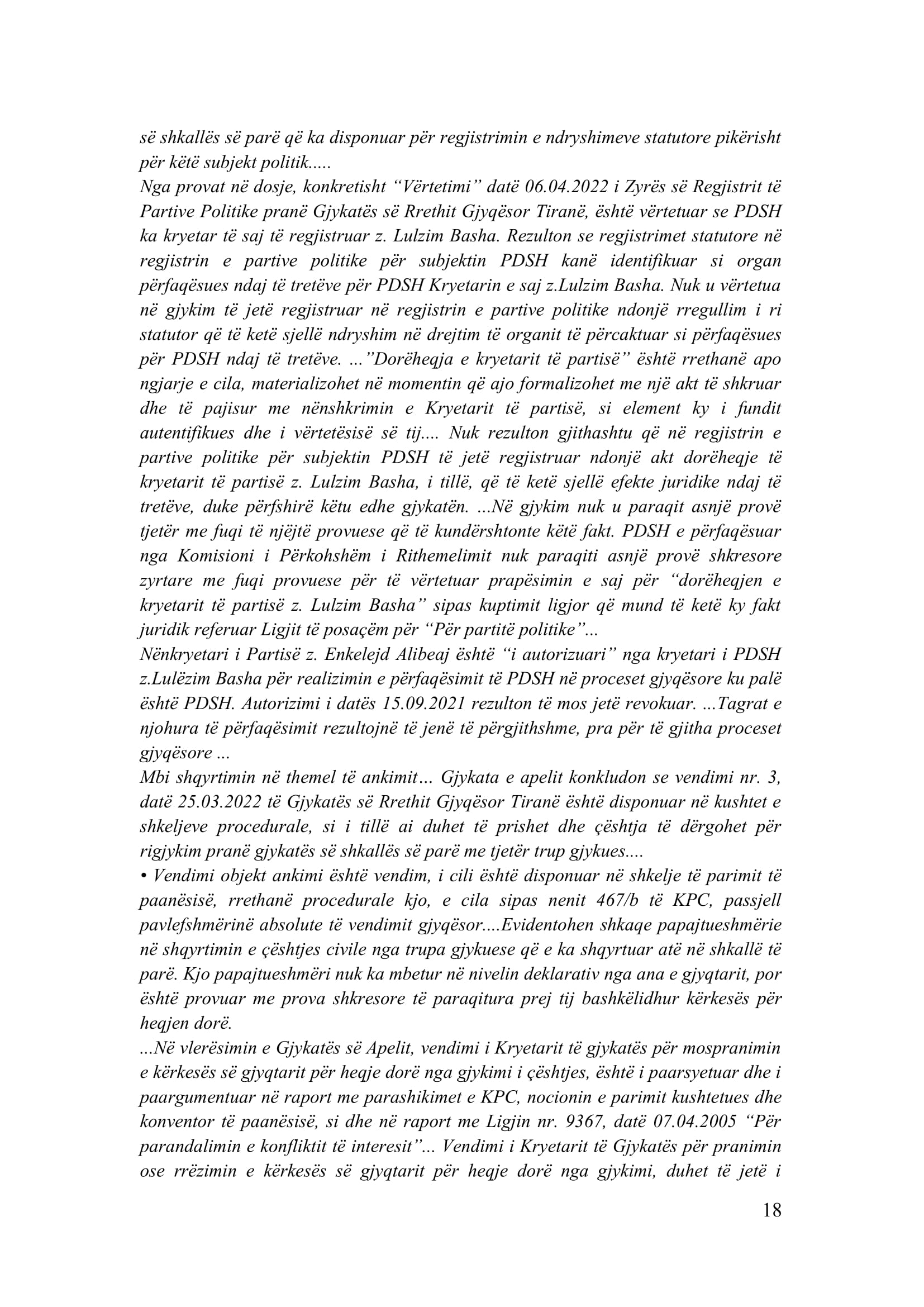 Zbardhet vendimi i Gjykatës së Apelit për vulën e PD-së që ja kaloi Sali Berishës. Apeli i dha të drejtën e vulës, ish-kryeministrit Sali Berisha dhe rrëzoi ankimin e bërë nga Lulzim Basha dhe Enkelejd Alibeaj. Në vendimin e tij Apeli vlerësoi të mos pranojë ankimin e bërë nga Enkelejd Alibeaj, si i autorizuar nga Lulzim Basha, kundër verdiktit të gjyqtarit të Tiranës Agron Zhukri, të 25 marsit 2022. Apeli arsyeton se Lulzim Basha nuk ka bërë një kërkesë në Gjykatën e Tiranës për t’u bërë pjesë në pocesin gjyqësor që ligjëroi Kuvendin Kombëtar të 11 dhjetorit 2021 të thirrur nga Berisha. “Pala ankuese nuk ka legjitimitet substancial për paraqitjen e ankimit, përsa kohë që nuk ka qenë palë dhe nuk ka patur asnjë cilësi proceduriale në këtë proces”, thuhej në vendimin e arsyetuar.