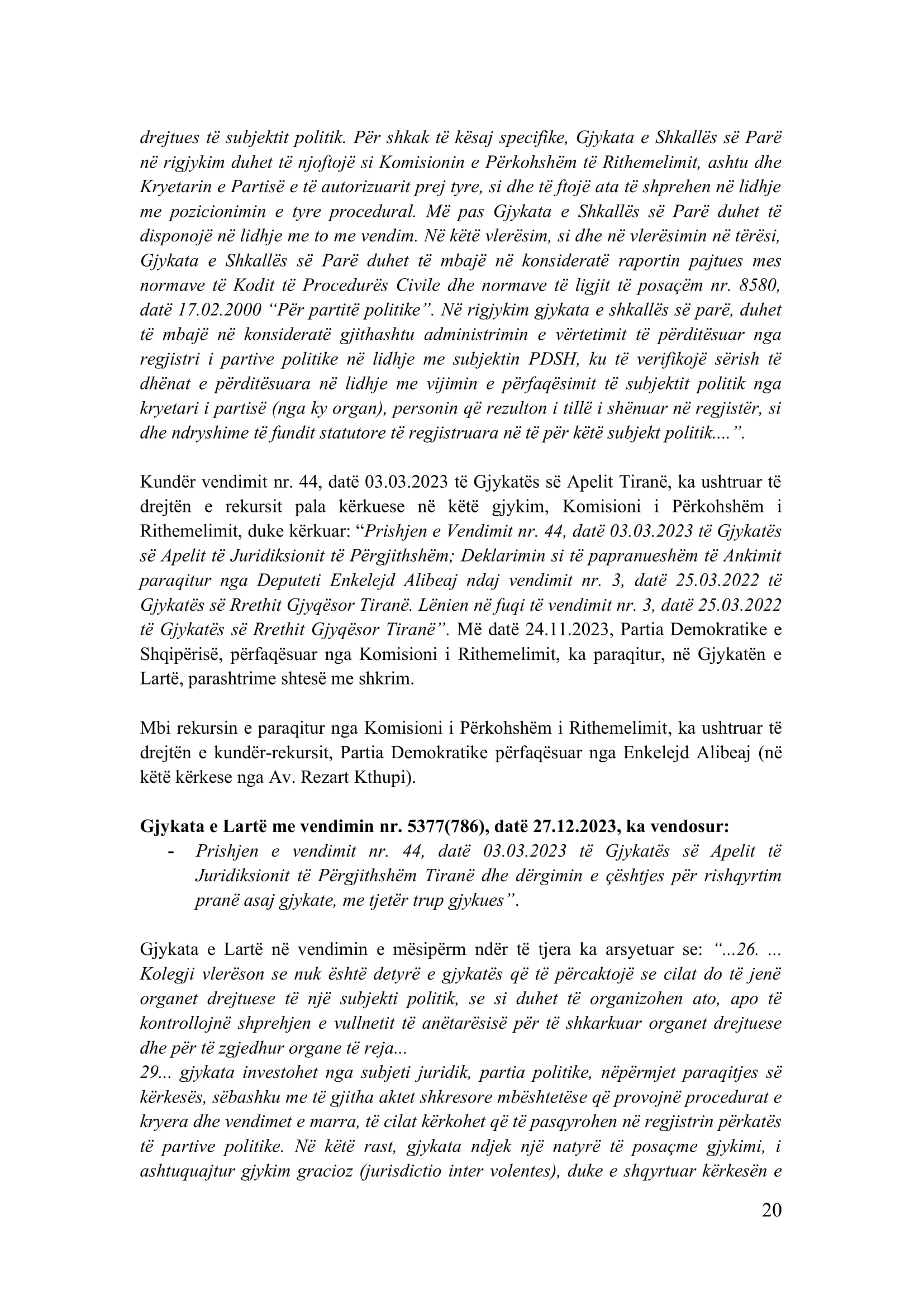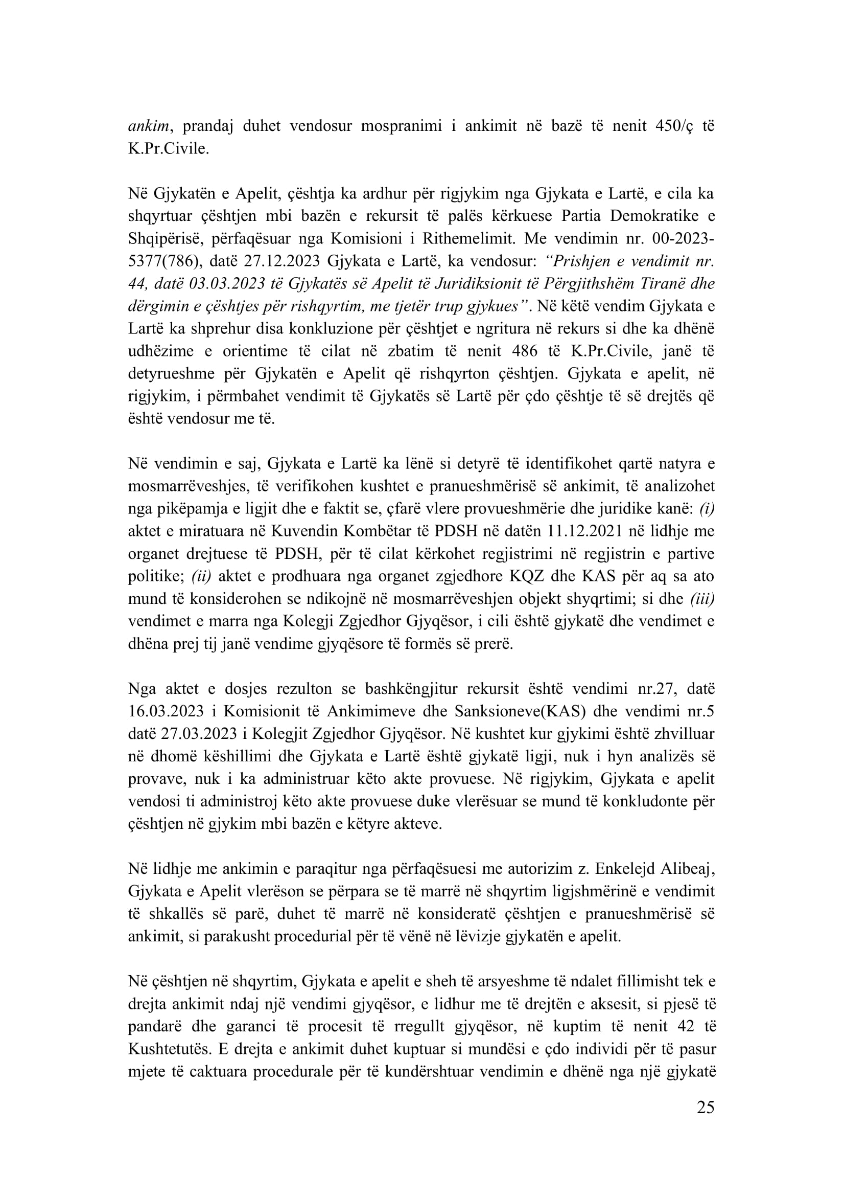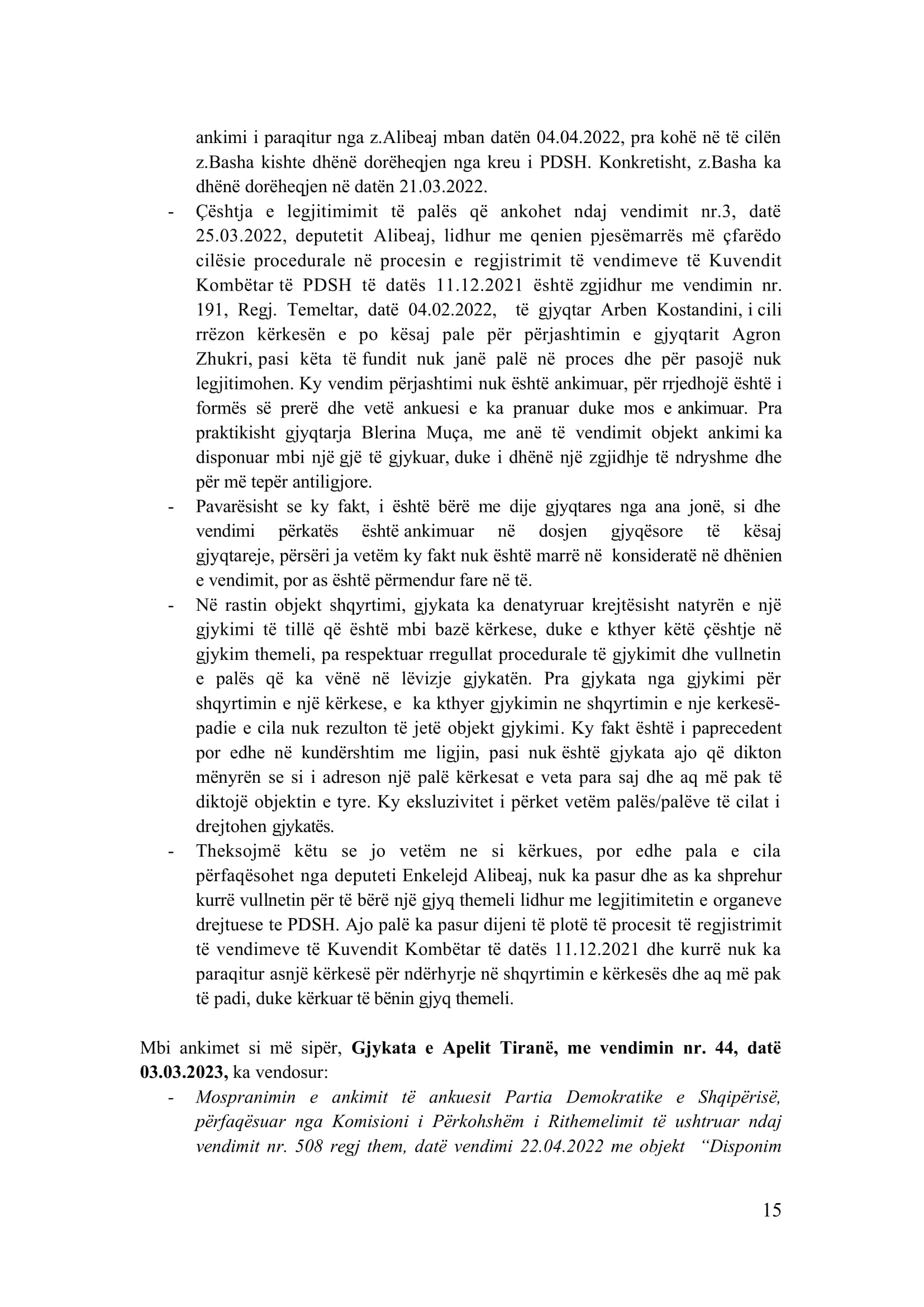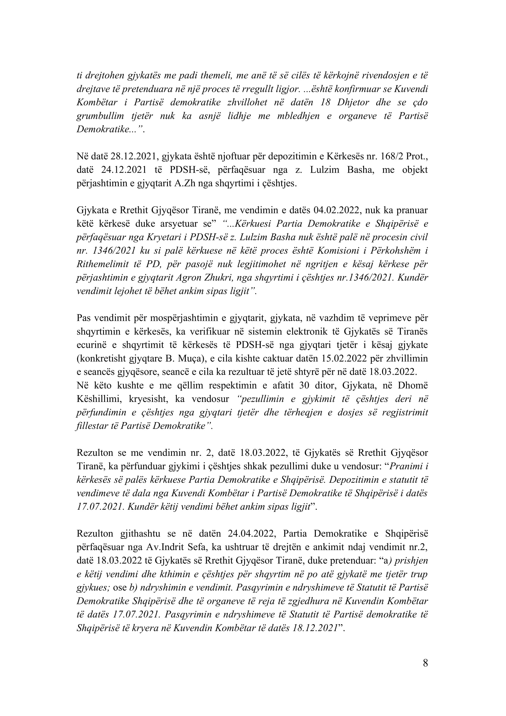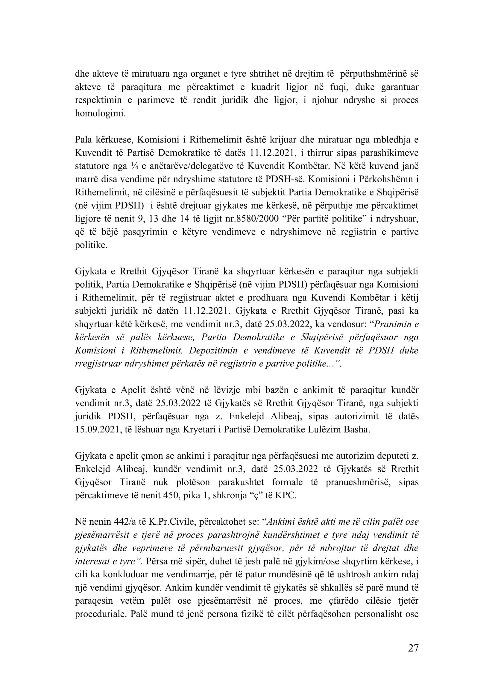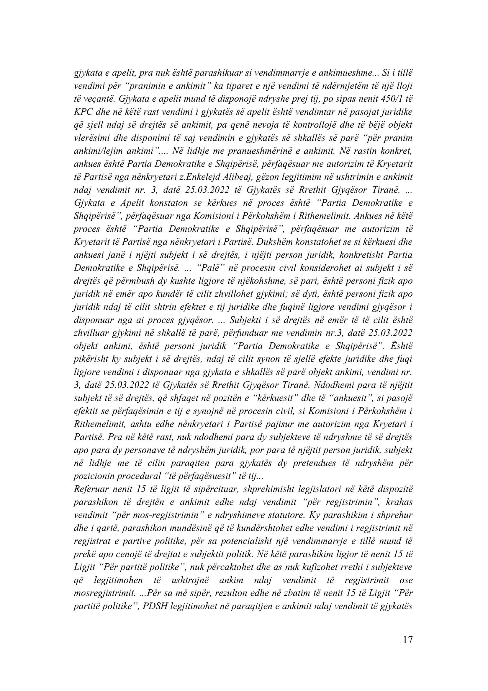 Zbardhet vendimi i Gjykatës së Apelit për vulën e PD-së që ja kaloi Sali Berishës. Apeli i dha të drejtën e vulës, ish-kryeministrit Sali Berisha dhe rrëzoi ankimin e bërë nga Lulzim Basha dhe Enkelejd Alibeaj. Në vendimin e tij Apeli vlerësoi të mos pranojë ankimin e bërë nga Enkelejd Alibeaj, si i autorizuar nga Lulzim Basha, kundër verdiktit të gjyqtarit të Tiranës Agron Zhukri, të 25 marsit 2022. Apeli arsyeton se Lulzim Basha nuk ka bërë një kërkesë në Gjykatën e Tiranës për t’u bërë pjesë në pocesin gjyqësor që ligjëroi Kuvendin Kombëtar të 11 dhjetorit 2021 të thirrur nga Berisha. “Pala ankuese nuk ka legjitimitet substancial për paraqitjen e ankimit, përsa kohë që nuk ka qenë palë dhe nuk ka patur asnjë cilësi proceduriale në këtë proces”, thuhej në vendimin e arsyetuar.