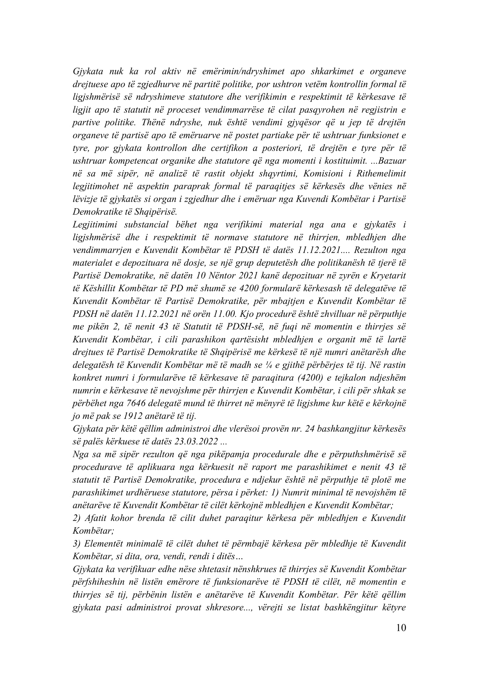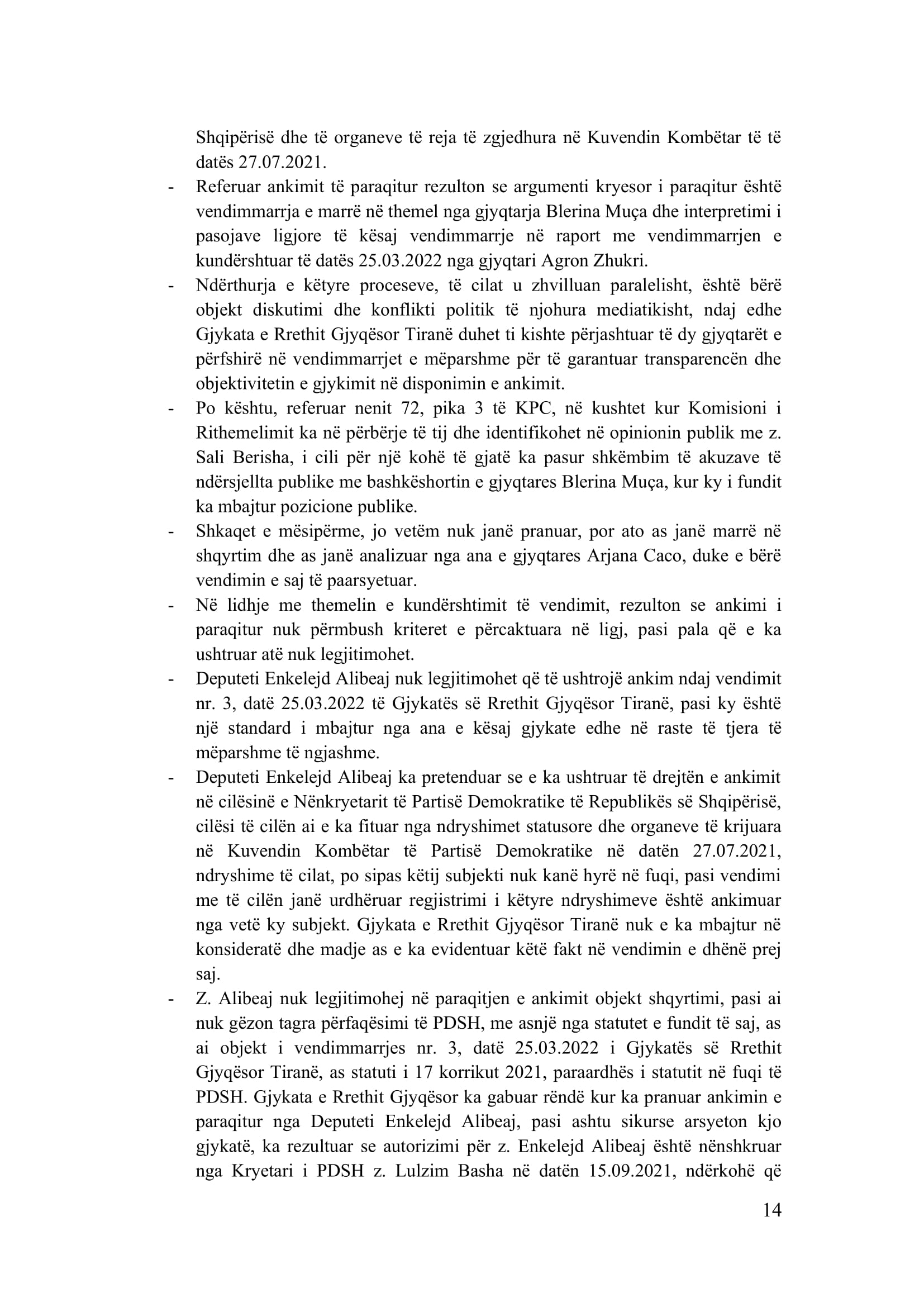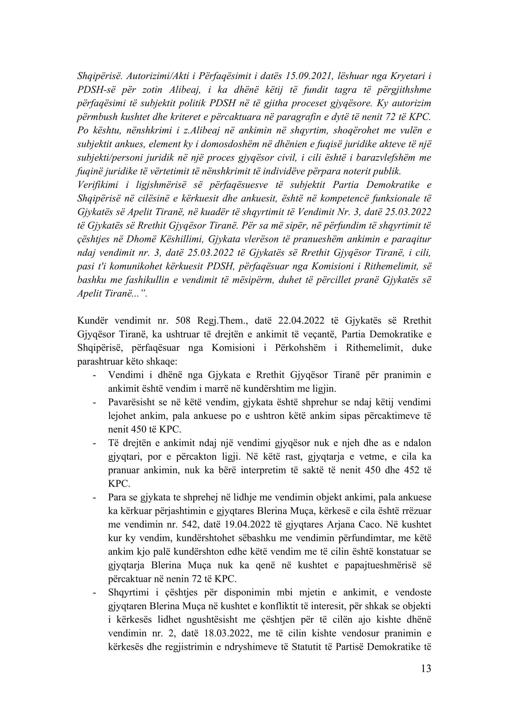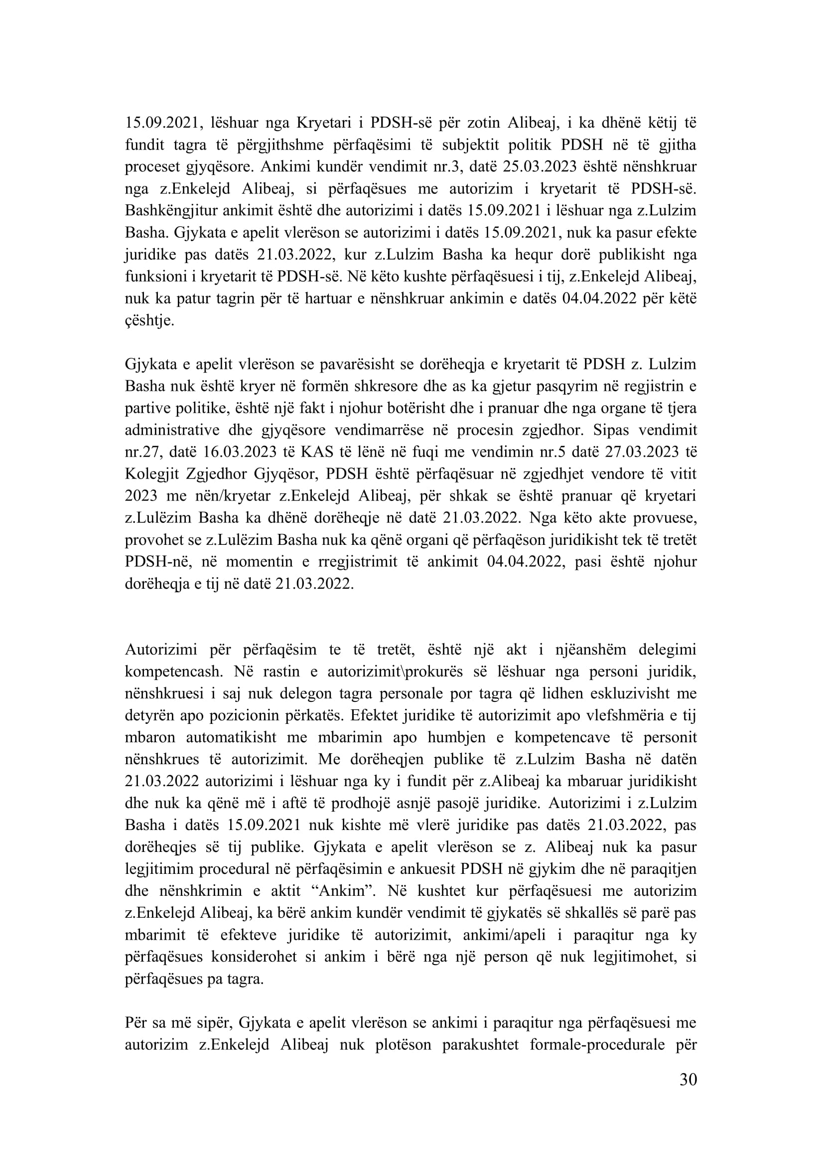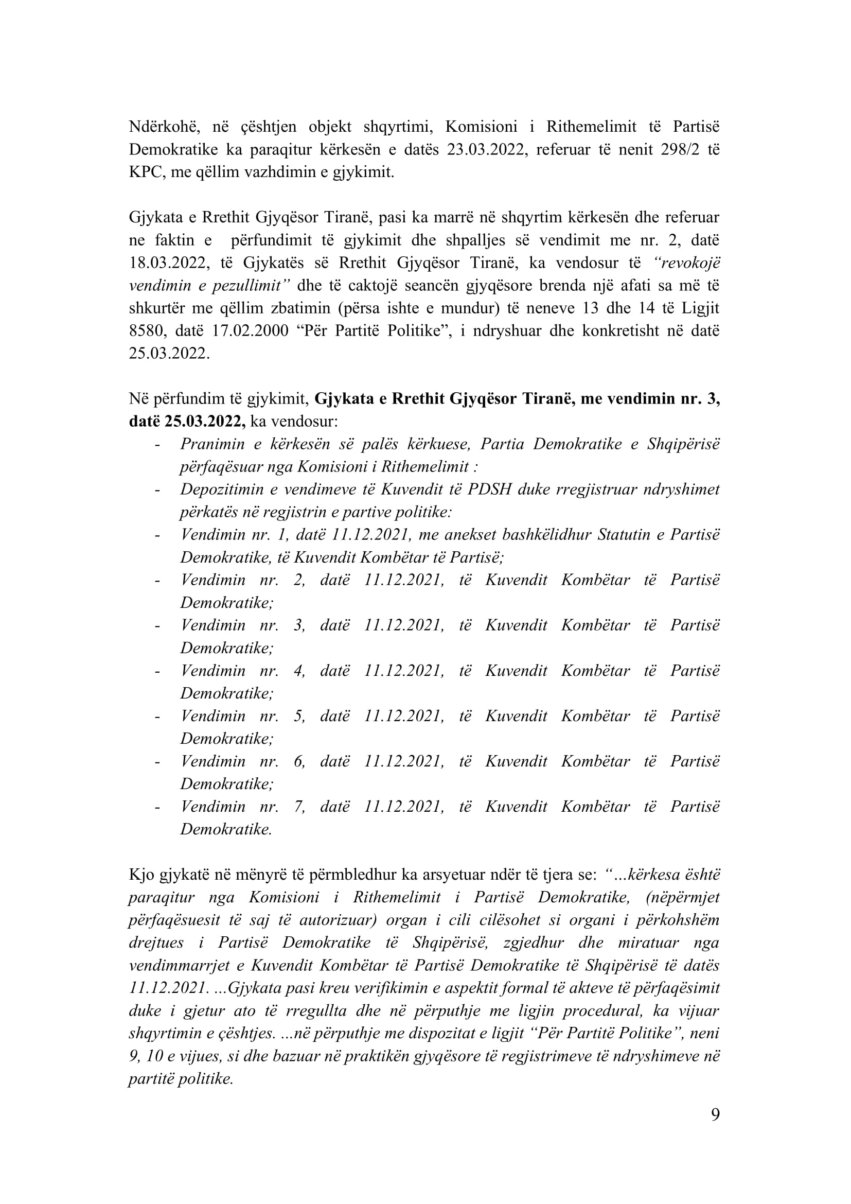 Zbardhet vendimi i Gjykatës së Apelit për vulën e PD-së që ja kaloi Sali Berishës. Apeli i dha të drejtën e vulës, ish-kryeministrit Sali Berisha dhe rrëzoi ankimin e bërë nga Lulzim Basha dhe Enkelejd Alibeaj. Në vendimin e tij Apeli vlerësoi të mos pranojë ankimin e bërë nga Enkelejd Alibeaj, si i autorizuar nga Lulzim Basha, kundër verdiktit të gjyqtarit të Tiranës Agron Zhukri, të 25 marsit 2022. Apeli arsyeton se Lulzim Basha nuk ka bërë një kërkesë në Gjykatën e Tiranës për t’u bërë pjesë në pocesin gjyqësor që ligjëroi Kuvendin Kombëtar të 11 dhjetorit 2021 të thirrur nga Berisha. “Pala ankuese nuk ka legjitimitet substancial për paraqitjen e ankimit, përsa kohë që nuk ka qenë palë dhe nuk ka patur asnjë cilësi proceduriale në këtë proces”, thuhej në vendimin e arsyetuar.