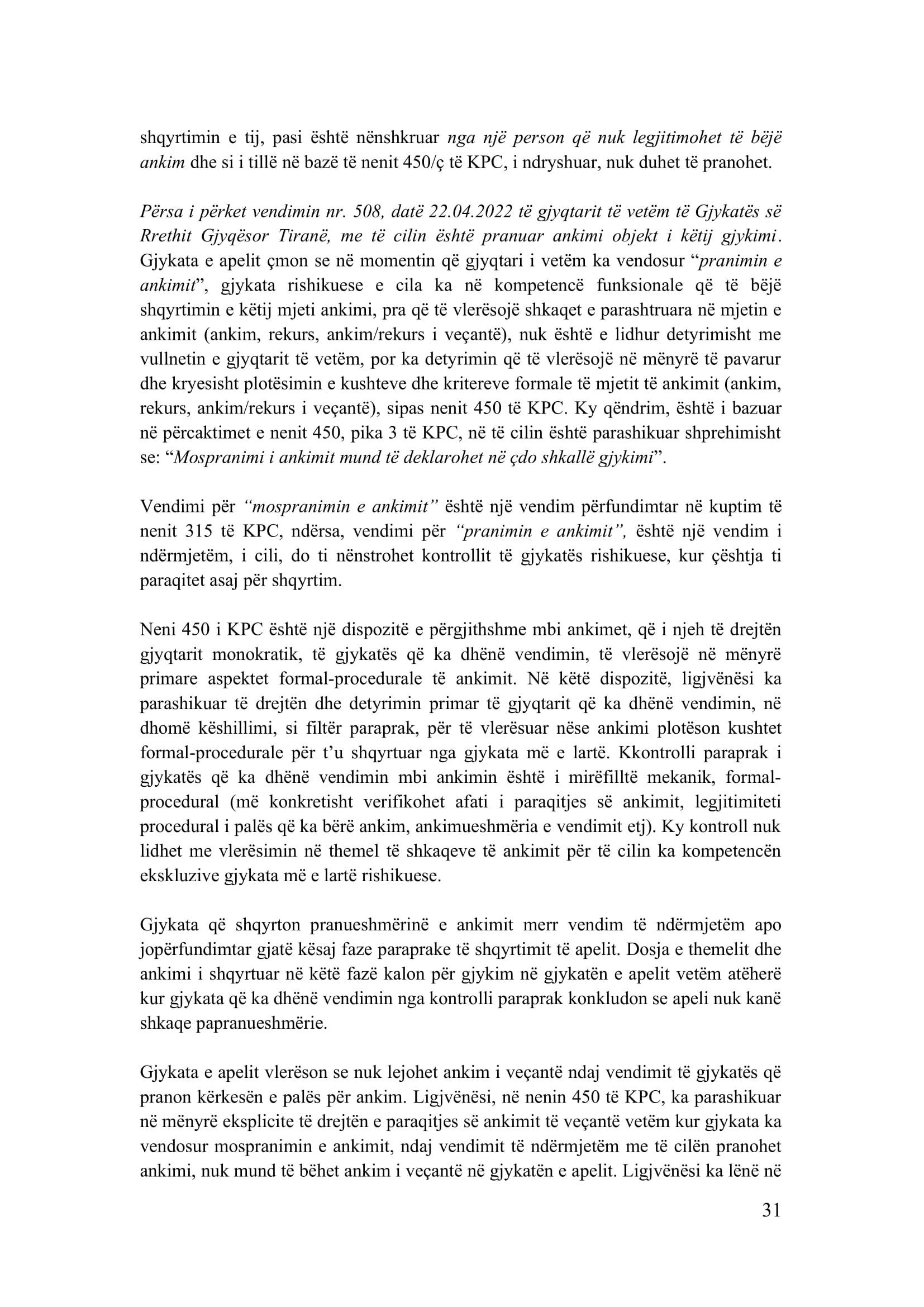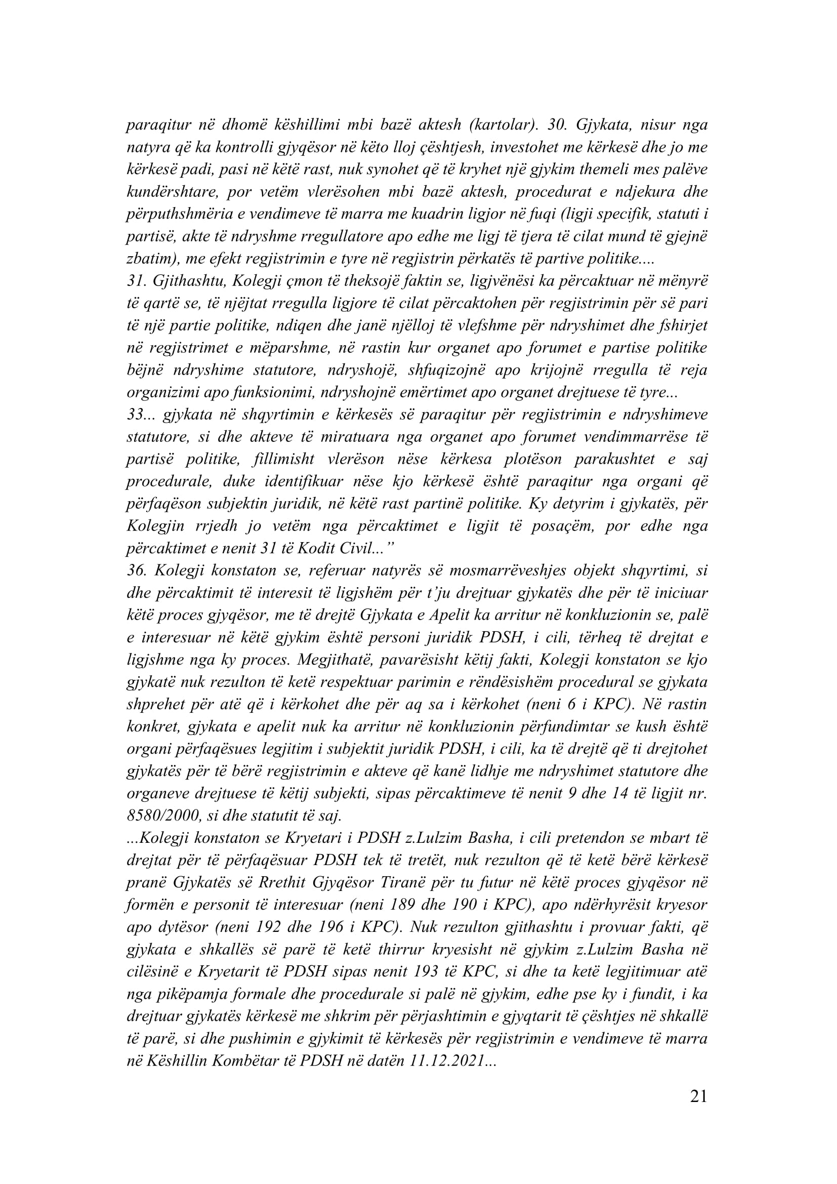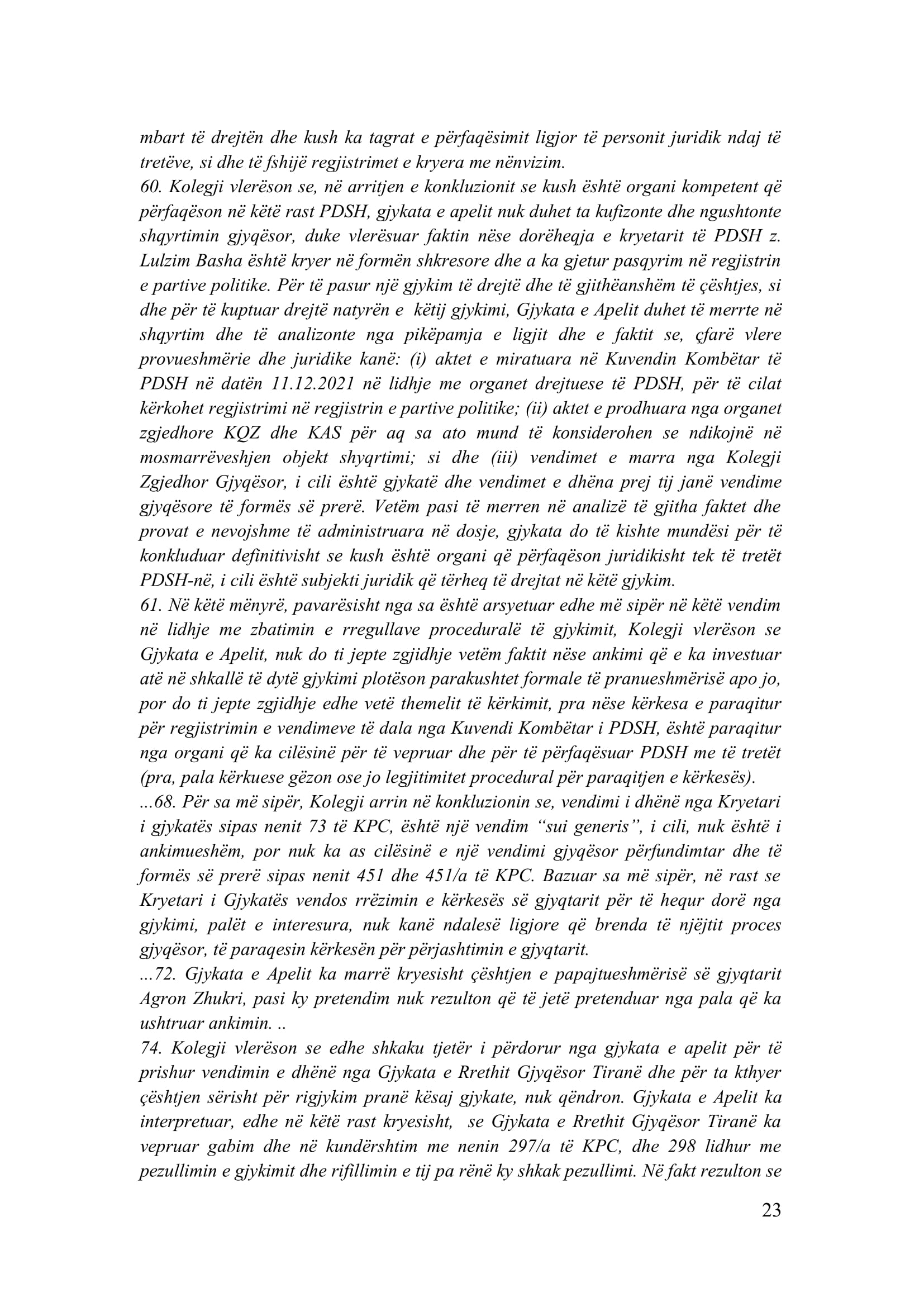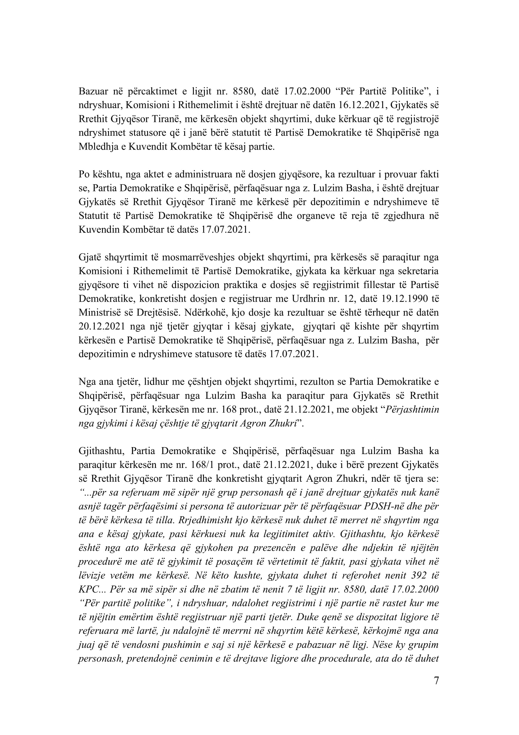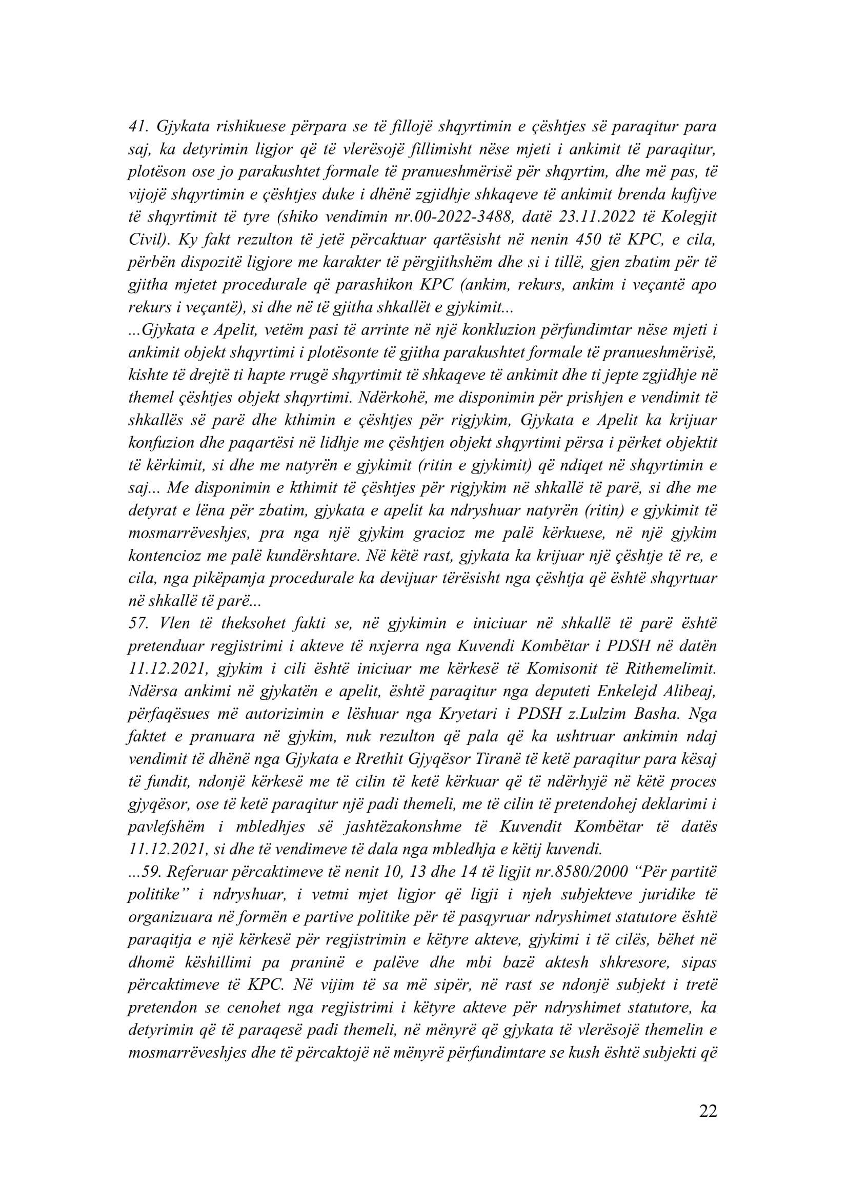 Zbardhet vendimi i Gjykatës së Apelit për vulën e PD-së që ja kaloi Sali Berishës. Apeli i dha të drejtën e vulës, ish-kryeministrit Sali Berisha dhe rrëzoi ankimin e bërë nga Lulzim Basha dhe Enkelejd Alibeaj. Në vendimin e tij Apeli vlerësoi të mos pranojë ankimin e bërë nga Enkelejd Alibeaj, si i autorizuar nga Lulzim Basha, kundër verdiktit të gjyqtarit të Tiranës Agron Zhukri, të 25 marsit 2022. Apeli arsyeton se Lulzim Basha nuk ka bërë një kërkesë në Gjykatën e Tiranës për t’u bërë pjesë në pocesin gjyqësor që ligjëroi Kuvendin Kombëtar të 11 dhjetorit 2021 të thirrur nga Berisha. “Pala ankuese nuk ka legjitimitet substancial për paraqitjen e ankimit, përsa kohë që nuk ka qenë palë dhe nuk ka patur asnjë cilësi proceduriale në këtë proces”, thuhej në vendimin e arsyetuar.