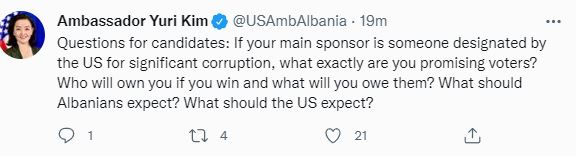 “Pyetje për kandidatët: Nëse drejtuesi juaj kryesor është i shpallur non grata nga SHBA për korrupsion të konsiderueshëm, çfarë saktësisht po u premtoni votuesve? Kush do t’ju drejtojë nëse fitoni dhe çfarë do t’u detyroheni atyre? Çfarë duhet të presin shqiptarët? Çfarë duhet të presin SHBA?”, shkruan Yuri Kim.