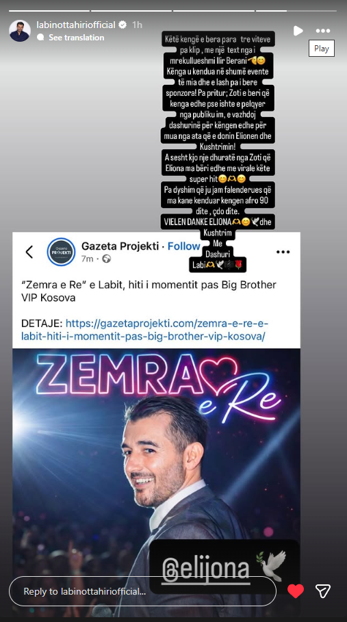 ”A s’është kjo një dhuratë nga Zoti që Eliona ma bëri edhe më virale këtë super hit? Pa dyshim që ju jam falënderues që ma kanë kënduar këngën afro 90 ditë, çdo ditë”,-u shpreh ai. Në fund të mesazhit, këngëtari e mbylli dedikimin me një falënderim të përzemërt edhe në gjuhën gjermane: “Vielen Danke Eliona dhe Kushtrim. Me dashuri, Labi”. Falë këtij promovimi spontan brenda shtëpisë së Big Brother VIP, kënga “Zemra e re” po përjeton një sukses të dytë dhe tashmë po dëgjohet gjithandej nga publiku.