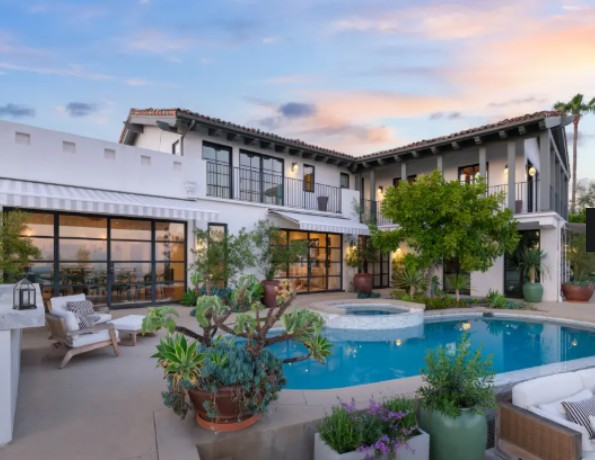Shtëpia është ndërtuar në stil spanjoll dhe ka gjithçka që mund të ëndërrojë një yll i Hollywood-it: 6 dhoma gjumi, 8 banjo, pishinë, kinema brenda në shtëpi dhe kopsht me perime të freskëta etj.