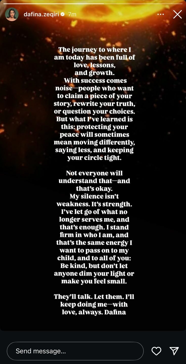 Reagimi i Dafina Zeqirit nuk vonoi. Në mënyrë elegante, por me një ton të qartë, ajo zgjodhi të përgjigjet përmes një postimi në Instagram Story, pa përmendur emra, por duke dhënë një mesazh të fortë për ata që mundohen të ndërhyjnë në paqen e saj. ”Udhëtimi për të ardhur deri këtu ku jam sot ka qenë i mbushur me dashuri, mësime dhe rritje me suksesin vjen edhe zhurma, njerëz që duan të marrin një pjesë nga historia jote, ta rishkruajnë të vërtetën tënde ose të vënë në dyshim zgjedhjet e tua”.