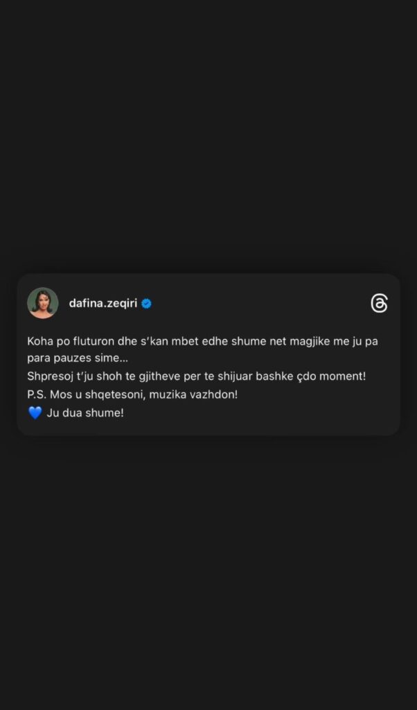 ”Koha po fluturon dhe s’kanë mbetur edhe shumë net magjike për t’ju parë para pauzës sime. Shpresoj t’ju shoh të gjithëve për të shijuar bashkë çdo moment! P.S. Mos u shqetësoni, muzika vazhdon! Ju dua shumë”.