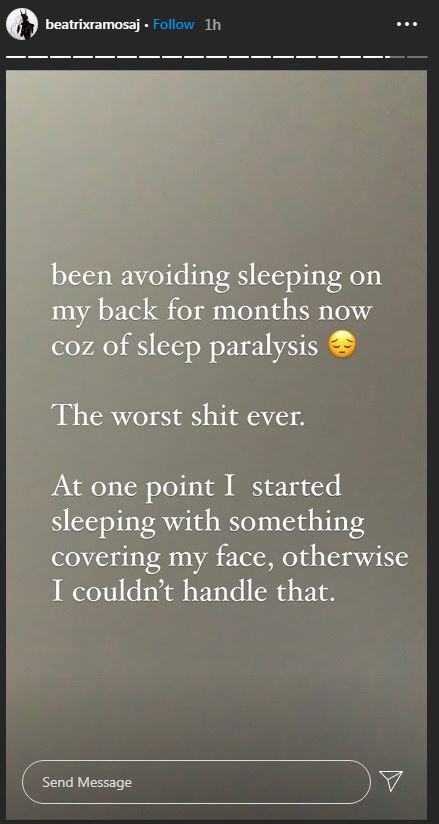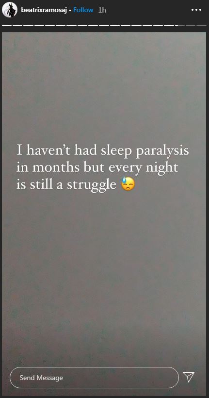 “Jam shumë e inatosur kam probleme me gjumin prej javësh. Nuk kam pasur probleme me paralizën e gjumit prej muajsh, por çdo mbrëmje është ende një luftë. Kam shmangur fjetjen me kurriz prej muajsh për shkak të paralizës së gjumit. Gjëja më e keqe. Kam nisur të fle me diçka para pë të mbuluar fytyrën, ndryshe nuk mund ta përballoja”, ka shkruar Beatrix.