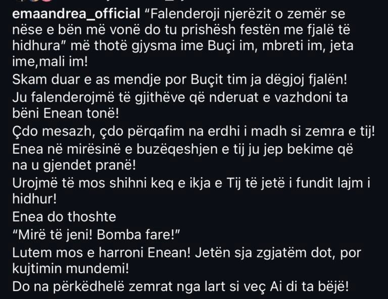 “Çdo mesazh dhe përqafim ka pasur peshën e një zemre të madhe, ashtu siç ishte edhe vetë Enea”, shkruan Andrea, duke nënvizuar se mbështetja e publikut ka qenë një burim force për familjen.