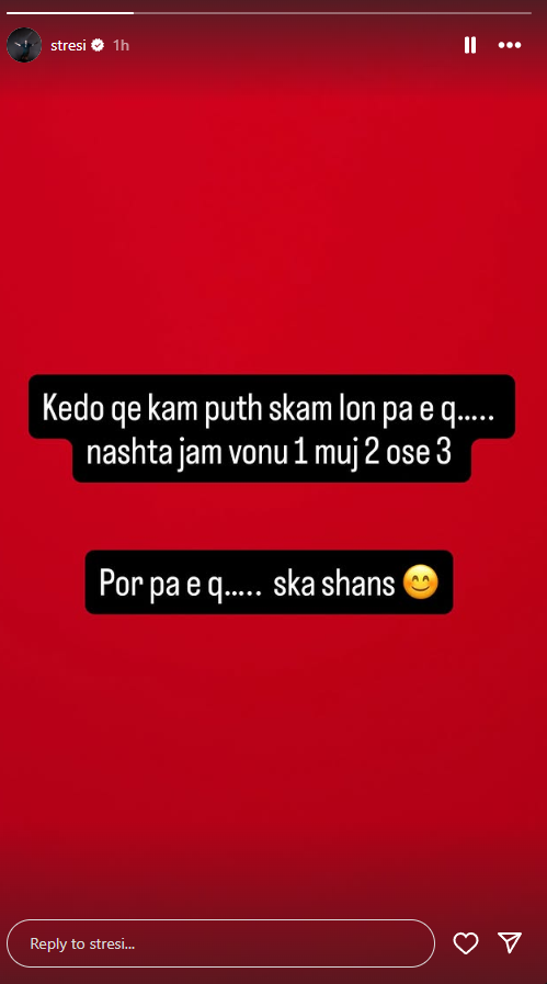 Por reagimi i Stresit nuk vonoi dhe është i çuditshëm. Reperi publikoi në Instastory një mesazh provokues, ku dukej si një thumb i drejtpërdrejtë ndaj Jozit: ”Këdo që kam puth në jet s’kam lon pa e q… Ndoshta ka shku javë, muj, dy a tre… po pa e q… s’e kom lon”.