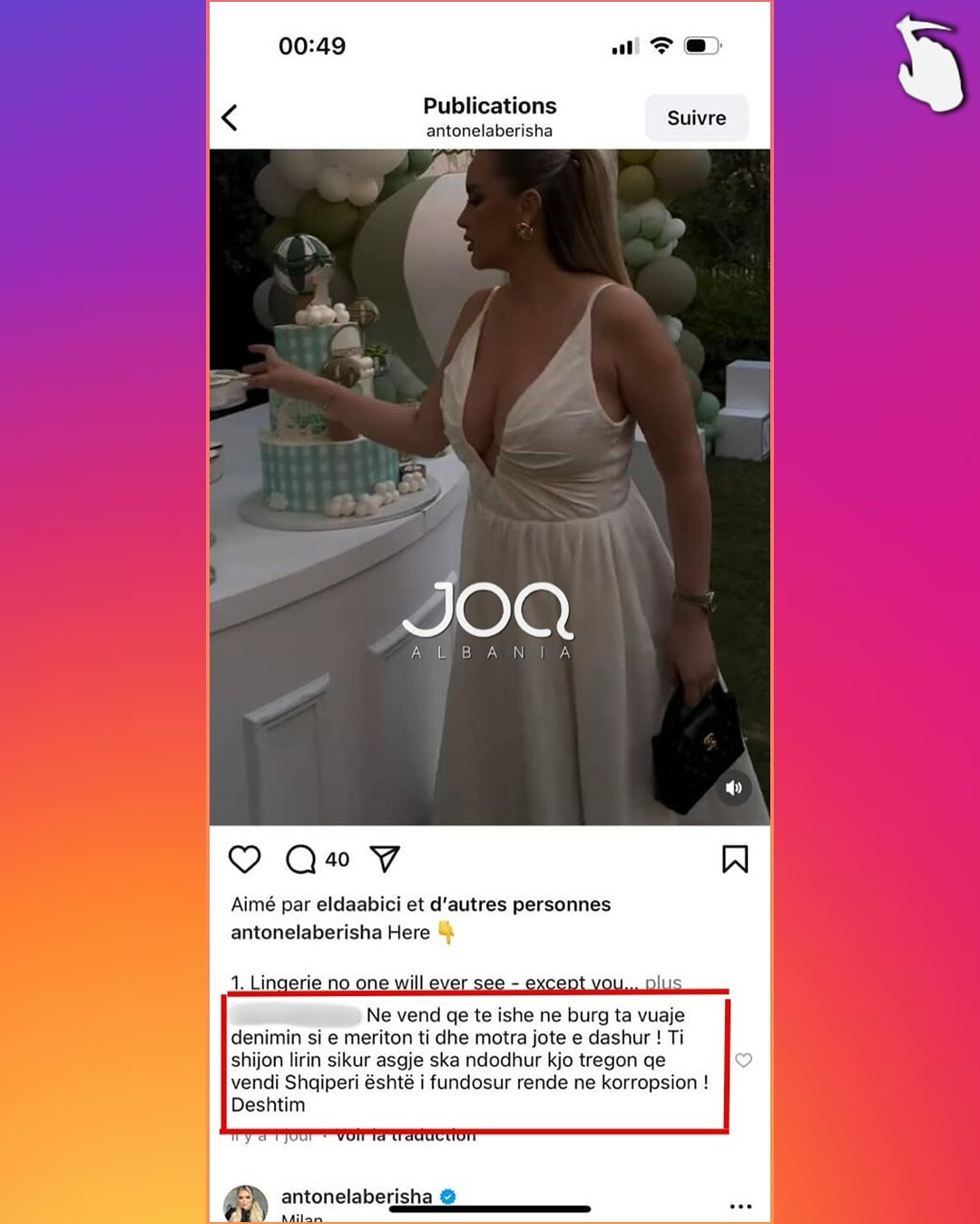 Ndjekësja në fjalë është shprehur për JOQ Albania se nuk kishte asgjë personale ndaj Antonelës, por komentoi si çdo përdorues tjetër në rrjet, dhe nuk e kishte pritur një reagim kaq ekstrem. Kjo përplasje e fundit ka nxitur reagime të shumta në publik, duke vënë në pikëpyetje mënyrën se si figurat publike menaxhojnë kritikën dhe rolin e tyre në ndërtimin e një diskursi më të matur në rrjetet sociale.