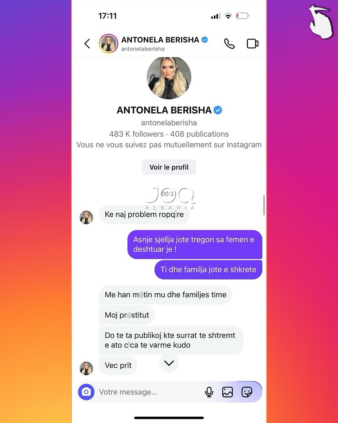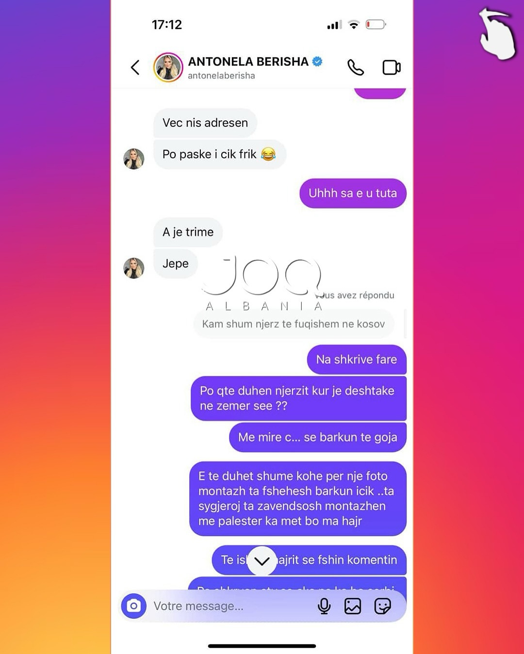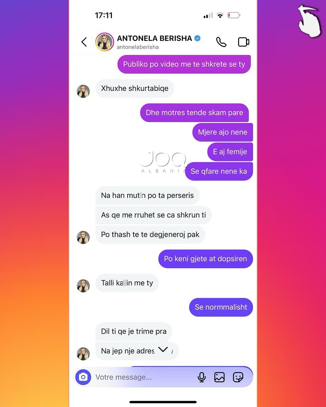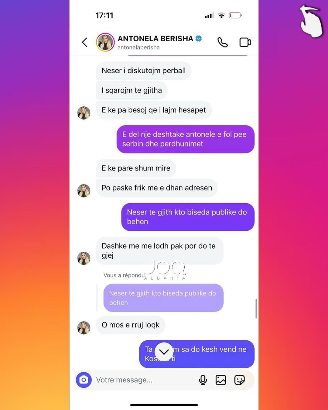 Pas këtij reagimi, Antonela i është drejtuar ndjekëses përmes mesazheve private, ku ka përdorur gjuhë fyese dhe kërcënuese, duke i kërkuar asaj takim për të “sqaruar situatën”. Përmes disa mesazheve të dërguara, ajo e fton ndjekësen të përballet me të dhe në disa raste i referohet me tone denigruese, madje duke kaluar në ofendime me përmbajtje etnike dhe aludime për dhunë.