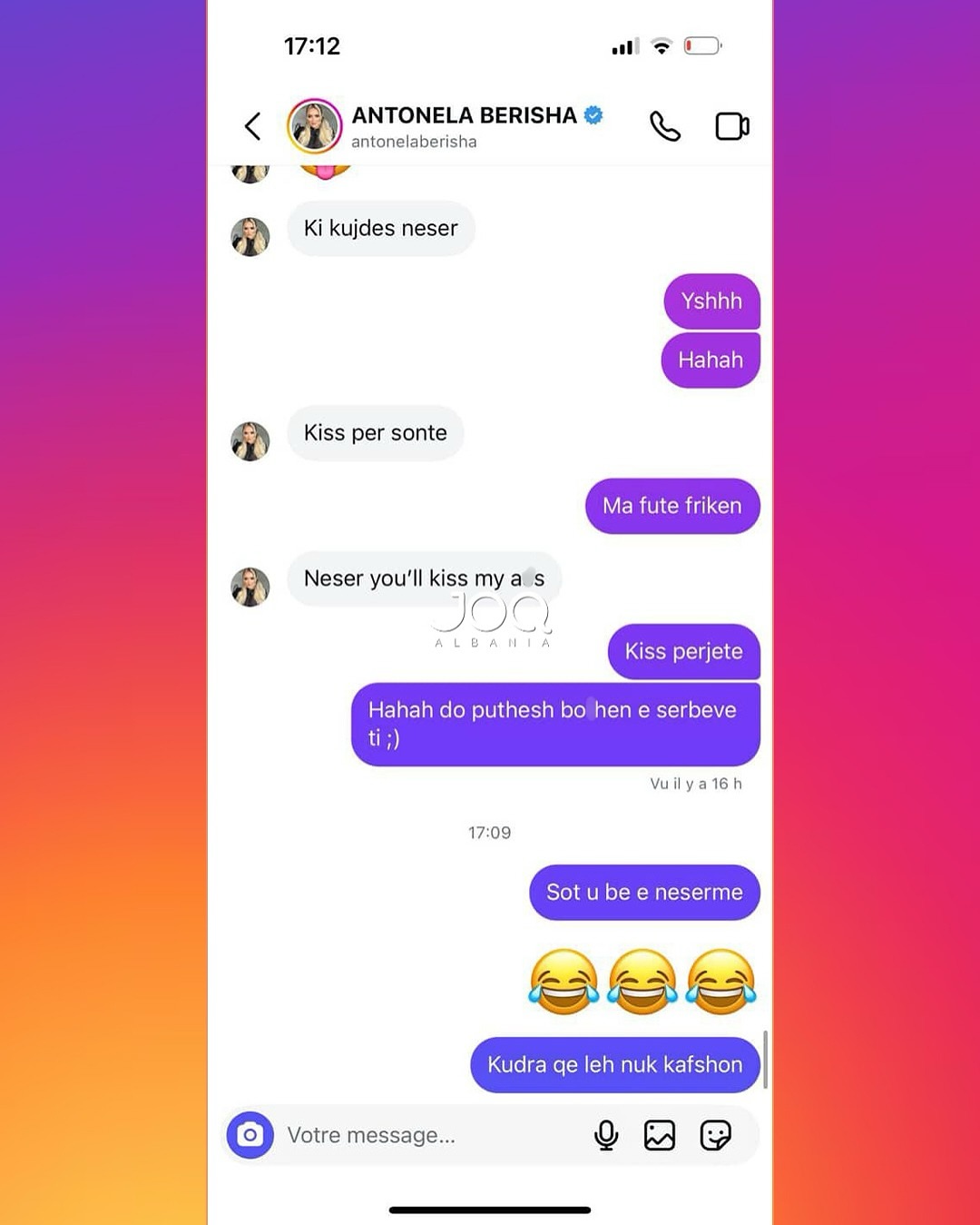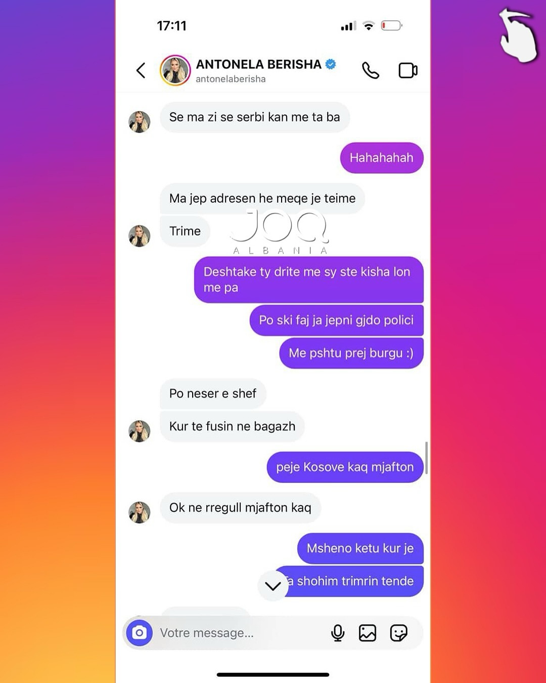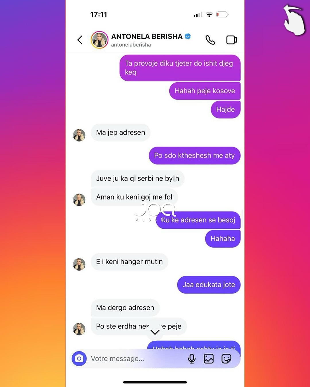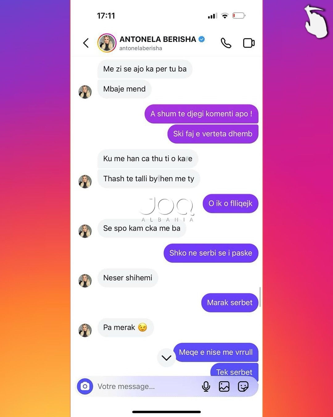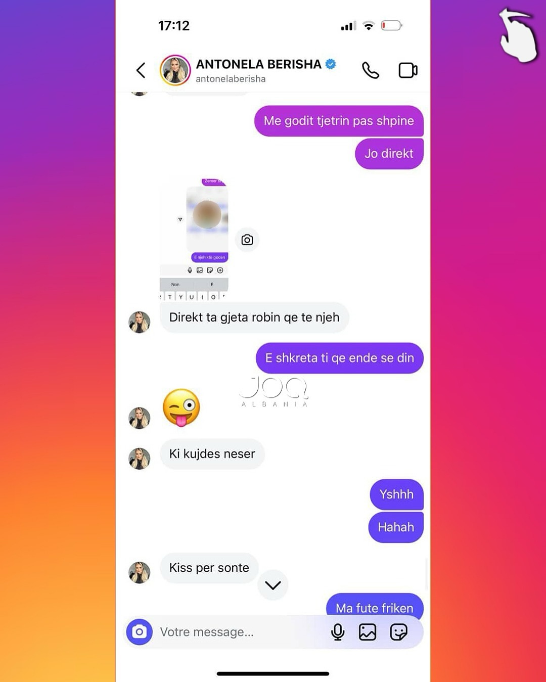 Pas këtij reagimi, Antonela i është drejtuar ndjekëses përmes mesazheve private, ku ka përdorur gjuhë fyese dhe kërcënuese, duke i kërkuar asaj takim për të “sqaruar situatën”. Përmes disa mesazheve të dërguara, ajo e fton ndjekësen të përballet me të dhe në disa raste i referohet me tone denigruese, madje duke kaluar në ofendime me përmbajtje etnike dhe aludime për dhunë.