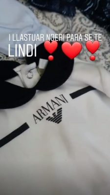 Për bebin ka edhe një bluzë të firmës “Armani”. Me shaka Alfio ka shkruar sipër fotove se djali po llastohet që para se të lindë me dhurata.