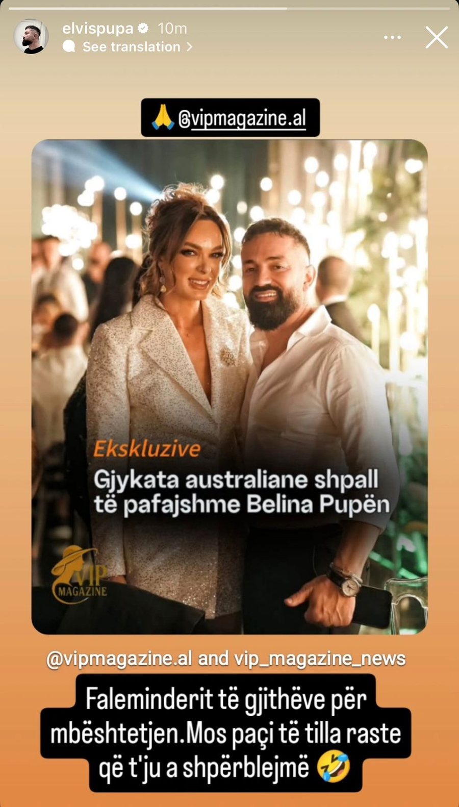 Pas disa muajsh në proces gjyqësor, Belina Pupa është shpallur e pafajshme nga Gjykata e Australisë, pas akuzave për kultivim lëndësh narkotike në një banesë të regjistruar në emrin e saj. Bashkëshorti i influencueses, aktori i humorit, Elvis Pupa ka ripostuar lajmin në Instagramin e tij dhe shkruan diçka. “Faleminderit të gjithëve për mbështetjen. Mos paçi të tilla raste që t’jua shpërblejmë”.