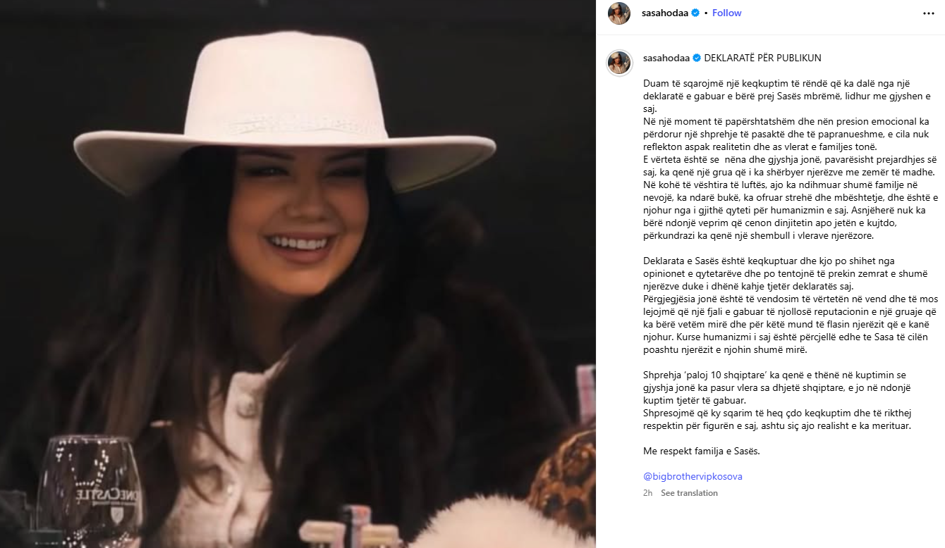 Familja e Sasa Hodës, banores së ”Big Brother Kosova Vip 4”, ka dalë me një reagim të gjatë publik pas deklaratës që ajo bëri mbrëmë lidhur me gjyshen e saj. Ata synojnë të qartësojnë atë që e përshkruajnë si një keqkuptim të madh, i cili ka lindur nga një fjali e gabuar e thënë nga Sasa në një moment të ngarkuar emocionalisht. Në reagimin e tyre, familjarët nënvizojnë se shprehja që Sasa përdori ishte jo vetëm e pasaktë, por edhe e papranueshme, duke mos përfaqësuar aspak bindjet dhe vlerat e familjes.