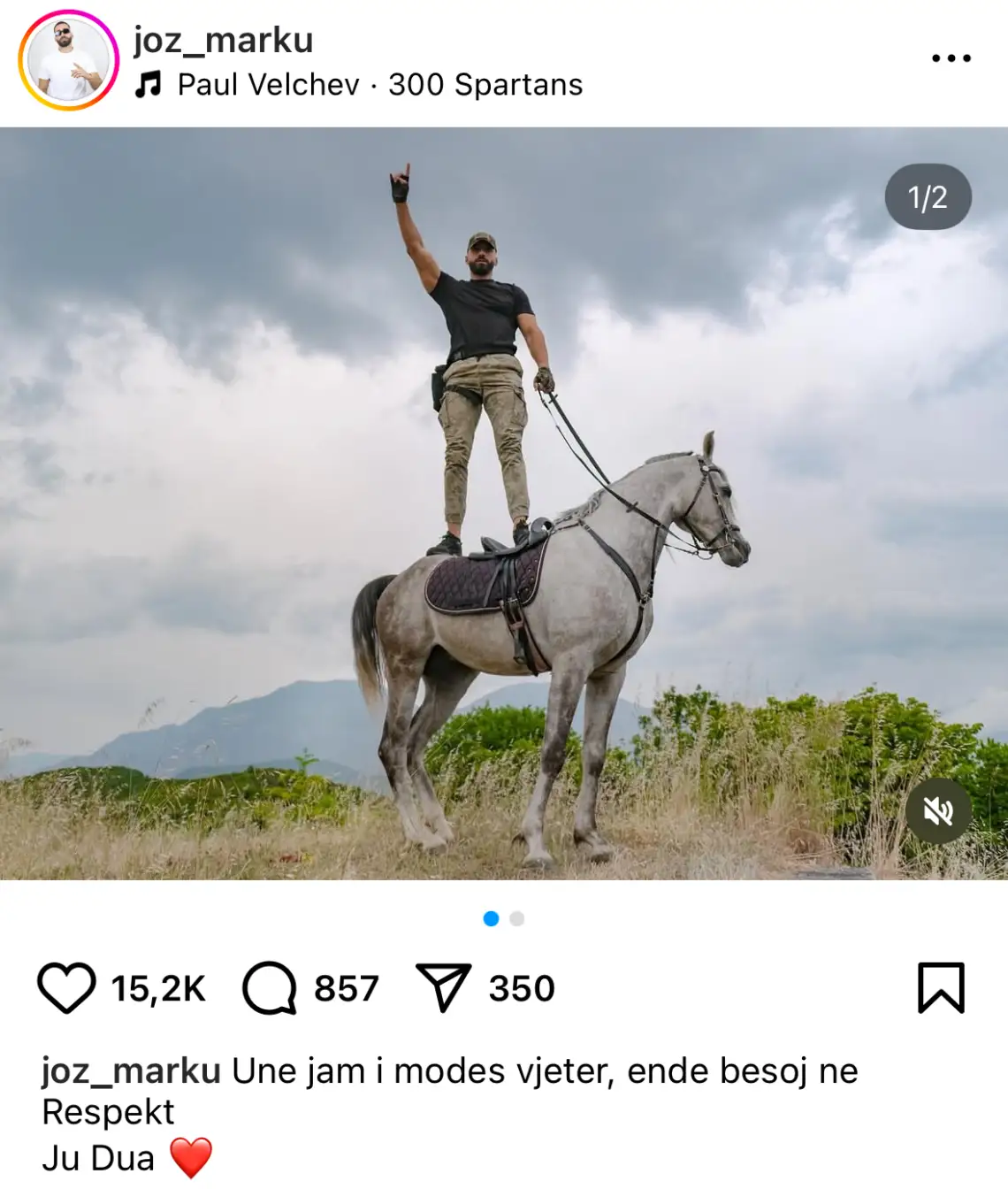 Një foto që ngjan me një skenë filmi – e ngarkuar me simbolikë dhe qetësi, duket si një përpjekje për të vendosur një narrativë të re për veten. Pa justifikime. Pa rikthime në atë çfarë ndodhi. Thjesht një figurë mbi kalë dhe një fjalë: “respekt”.