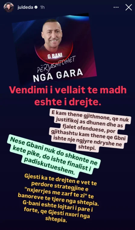 “Vendimi i produksionit është i drejtë. Kam theksuar gjithmonë që as dhuna dhe as fjalët ofenduese nuk mund të justifikohen, por po ashtu kam theksuar se G Bani ishte një lojtar me një karakter të veçantë në këtë edicion”, tha Jul Deda.
