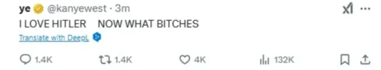 Kanye West ka shkaktuar një valë reagimesh, ku ka shprehur mendime antisemite, seksiste dhe homofobike. Ai ka deklaruar se është simpatizant i ideologjisë naziste dhe ka shprehur admirimin e tij për Adolf Hitlerin.