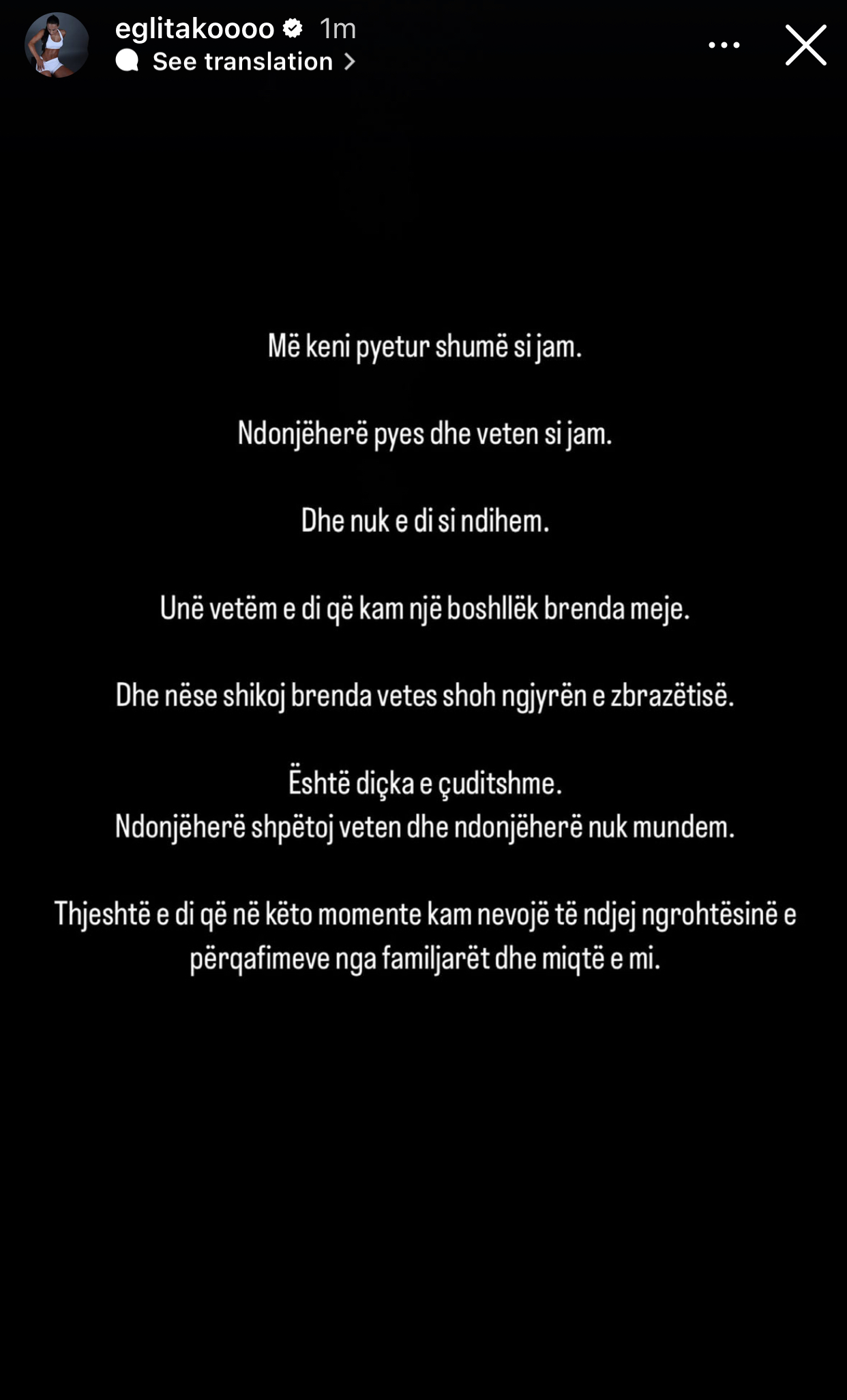 Egli Tako la garën disa orë më parë për shkaqe shëndetësore. Por largimi i saj nga “Big Brother Albania Vip 4”, vjen në një moment të fortë. Në reagimin e parë, ajo tregon se ndjen brenda vetes një boshllëk dhe se sheh ngjyrën e zbrazëtisë.