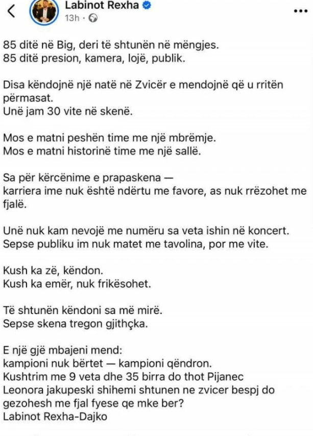 Këngëtari Labinot Rexha duket se nuk po gjen qetësi as pas eliminimit nga shtëpia e Big Brother VIP Kosova, pasi së fundmi ka shpërthyer me akuza të forta në rrjetet sociale ndaj banorëve, ish-banorëve dhe produksionit të spektaklit.