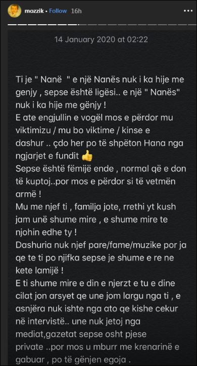 Ti je nënë dhe një nëne nuk i ka hije të gënjejë, sepse është ligësi. Atë engjëllin e vogël mos e përdor për t’u viktimizuar, për t’u bërë viktimë, kinse e dashur. Çdo herë po të shpëton Hana nga ngjarjet e fundit. Sepse është fëmijë ende, normal që e do, të kuptoj, por mos e përdor si të vetmen armë”- shkruan në Instagram.