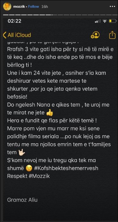 Menjëherë pas intervistës së Loredanës, ka reaguar Mozzik me disa postime të njëpasnjëshme në Instastory.