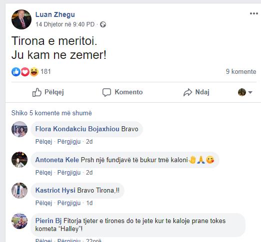 Asaj faqe i është bërë report/denoncim dhe shumë shpejt do ta zgjidhin autoritetet përkatëse. Ju falenderoj përzemërsisht për dashamirësinë tuaj dhe mbështetjen. Do të vij shumë shpejt tek ju me projekte të reja. Sinqerisht ! Luan Zhegu.”