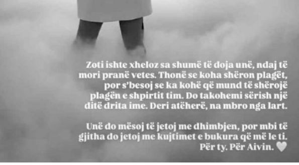 “Zoti ishte xheloz sa shumë të doja unë, ndaj të mori pranë vetes. Thonë se koha shëron plagët, por s’besoj se ka kohë që mund të shërojë plagën e shpirtit tim. Do takohemi sërish një ditë drita ime. Deri atëherë, na mbro nga lart. Unë do mësoj të jetoj me dhimbjen, por mbi të gjitha do të jetoj me kujtimet e bukura që më le ti. Për ty. Për Aivin”,-shkruan Sindi Salaj, teksa ndan një fotografi të veçantë me bashkëshortin dhe vajzën e tyre të mitur.