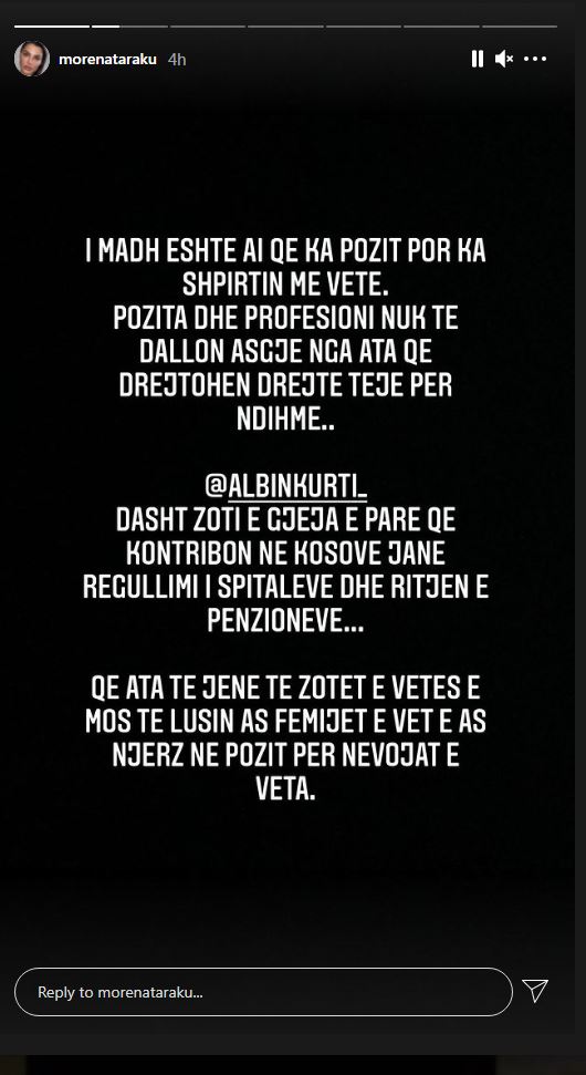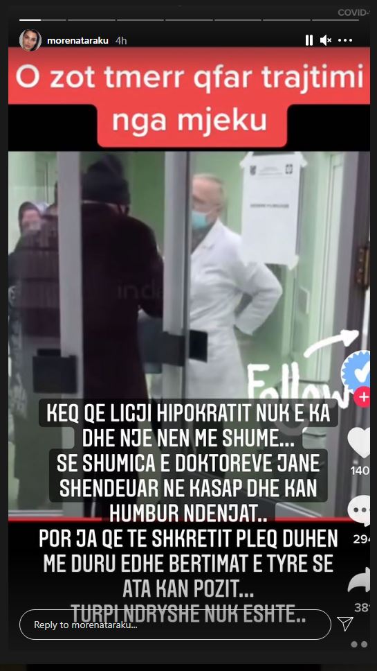 Përmes një postimi në Instastory, Morena shprehet se mjekët janë shndërruar në kasapë dhe veprojnë kështu vetëm për shkak të pozitës që kanë.