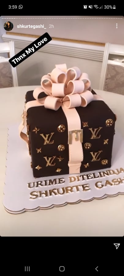 Ky i fundit i ka bërë një tortë me inicialet e markës “Louis Vuitton” dhe në të shkruhet: “Urime ditëlindja Shkurte Gashi”.