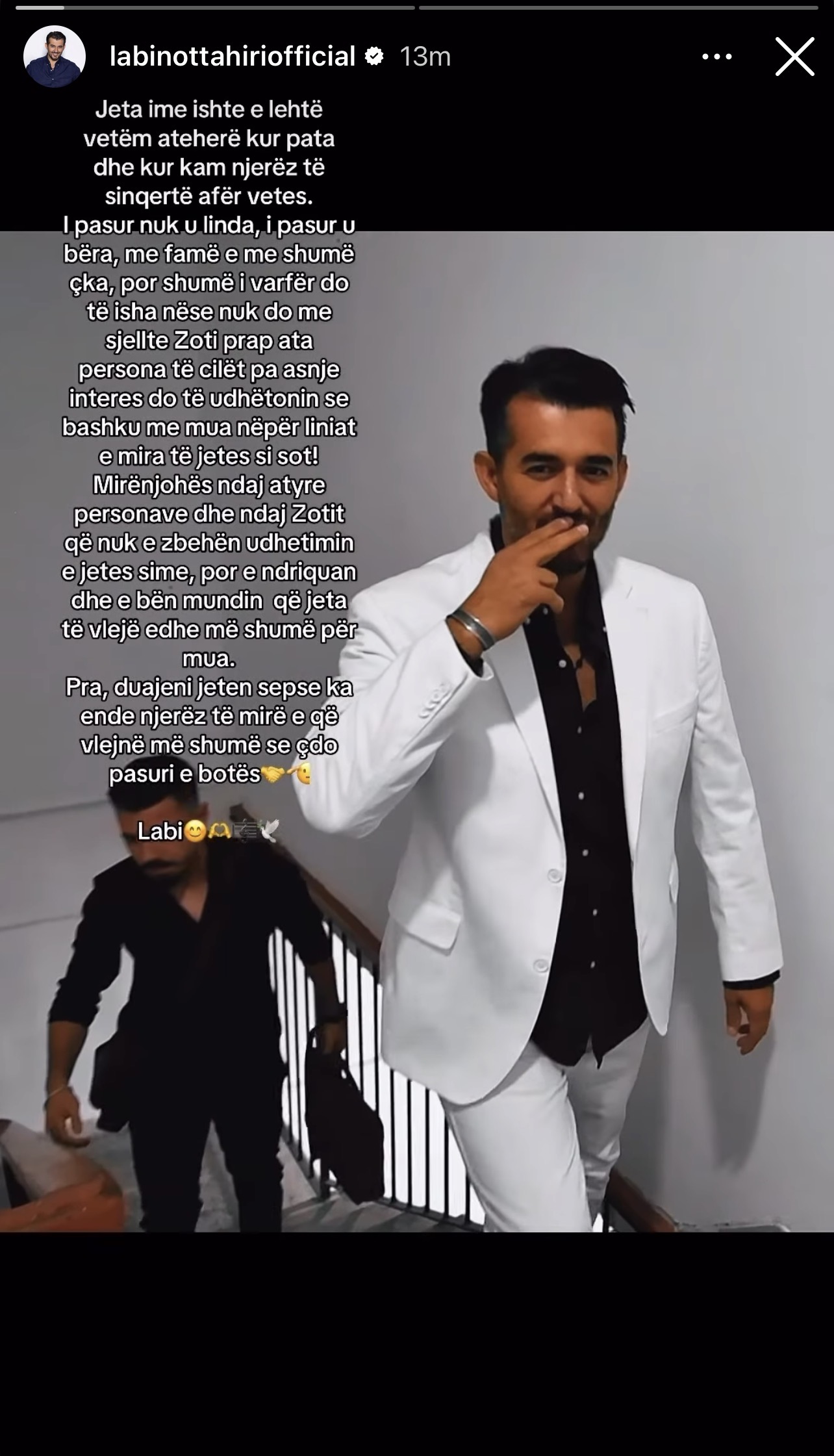 Labinot Tahiri, ose i njohur edhe si këngëtari i popullit pasi me ta ndan gjithçka, këtë herë ka ndarë një mesazh personal dhe reflektues, siç gjithmonë i ka dhe i ndan me ndjekësit. Këngëtari ndalet te rruga e tij nga varfëria drejt suksesit, duke theksuar se pasuria e vërtetë nuk matet me para, por me njerëzit që ke pranë.