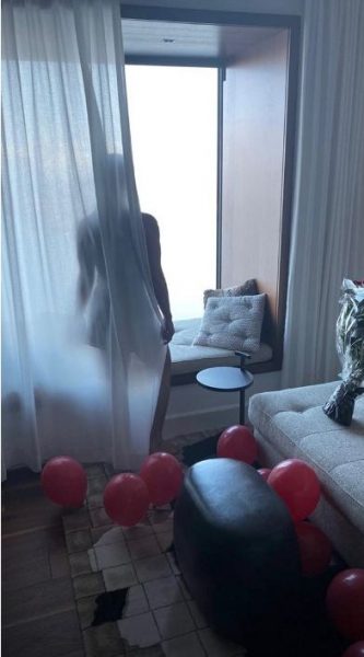 Trëndafila dhe balona të kuq në dhomën e saj të gjumit, teksa ajo po relaksohej me pamjen nga dritarja.