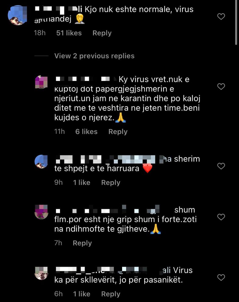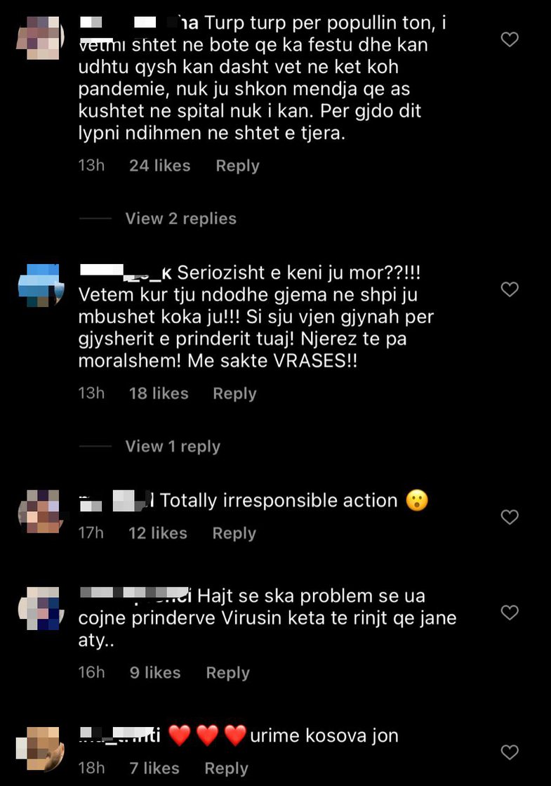 “Ku janë Policia e Kosovës dhe gazetat që po thonë ‘virusi, virusi’?” pyet dikush. “Faji është i atyre që kanë organizuar eventin dhe i yti që këndon dhe i publikon të tilla gjëra! Dhe përgjigjesh dhe pa të keq me ‘e kam djeg virusin sonte’,” shton një tjetër.