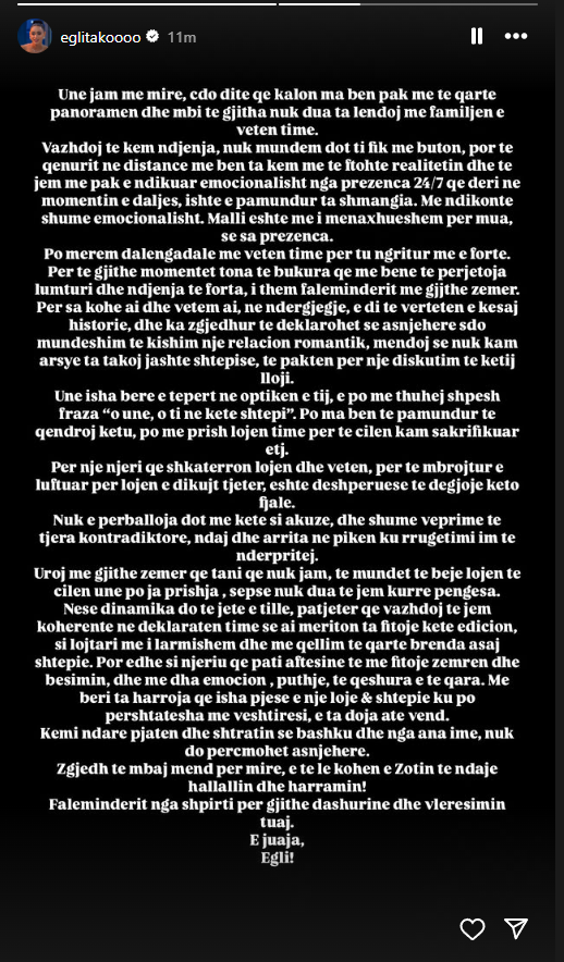 Ajo është personazhi më i komentuar. Egli Tako ka thyer heshtjen përmes një shkrimi të gjatë. E para vërteton që nuk është në një dhomë në Big Brother, dhe e dyta, tregon çfarë përjetoi dhe pse iku nga gara. Egli shkruan se mediatikisht nuk është dhënë versioni që Gjesti i dha ndjenja, puthje dhe një raport. Për të Gjesti arriti në pikën që donte të ishte ai, ose ajo në atë shtëpi.