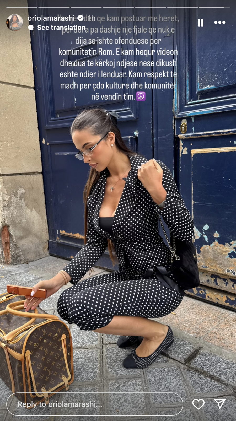 “Në një video që kam postuar më herët, përdora pa dashje një fjalë që nuk e dija se ishte ofenduese për komunitetin rom. E kam hequr videon dhe dua të kërkoj ndjesë nëse dikush është ndjerë i lënduar. Kam respekt të madh për çdo kulturë dhe komunitet në vendin tim”.