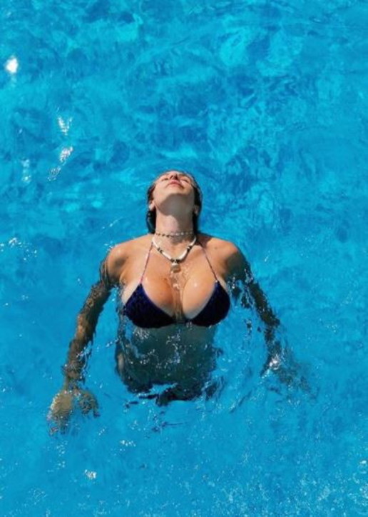 Fotoja e ndarë në rrjetin social është një foto ku Caruso shfaqet e zhveshur dhe mbulon gjoksin zbuluar vetëm me yje duke parë djallëzore aparatin fotografik.