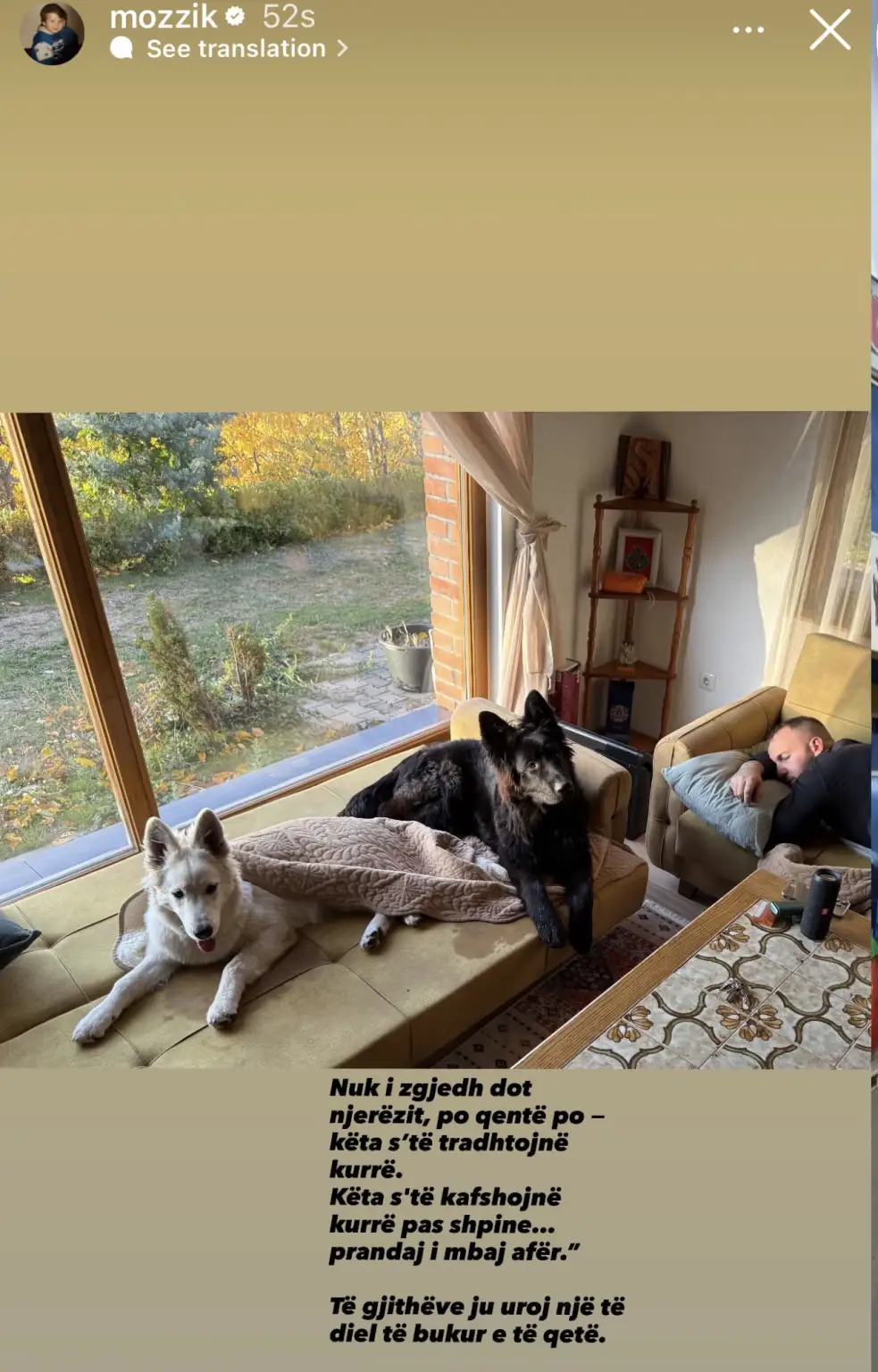 Në një foto të publikuar në profilin e tij, artisti nga Ferizaj ka shkruar: “Qentë s’të tradhtojnë kurrë, s’të kafshojnë pas shpine… prandaj i mbaj afër.”