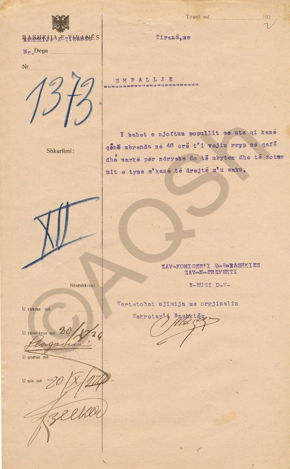 Nuk bëhet fjalë për ditët e sotshme, por për vitin 1924. Siç duket, qentë pa zot kanë qenë shtuar aq sa, sipas Bashkisë së Tiranës, qenë kthyer në rrezik të shëndetit publik. Për eliminimin e tyre do të përdorej strihninë, një lloj pesticidi që rëndom përdoret për të luftuar brejtësit. Sipas një njoftimi të po atij viti, lajmërohen zotëruesit e qenve shtëpiakë që t’i mbajnë ata lidhur, për të mos u eliminuar gabimisht. Foto: AQSh.